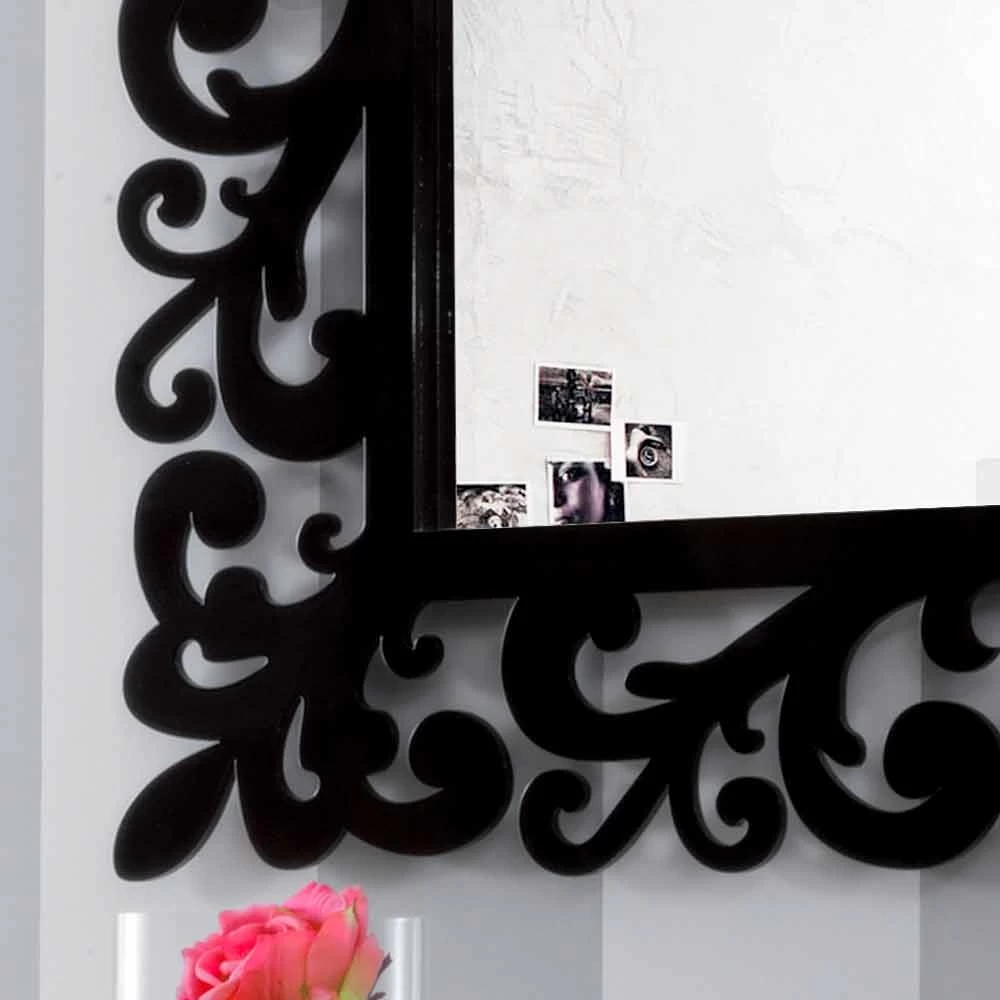 Miroir en bois noir poli avec design mural rectangulaire avec cadre décoré, fabriqué en Italie.