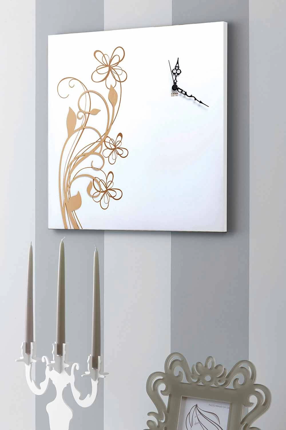 Horloge murale design carrée en bois blanc avec décoration florale en bois naturel, moderne et fabriquée en Italie.
