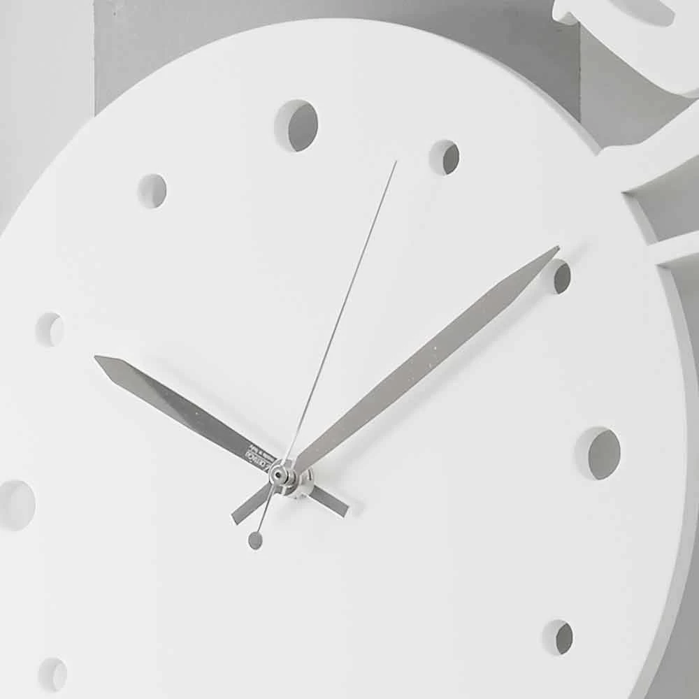 Grande horloge murale originale au design rond moderne, en bois blanc, noir ou gris, avec des chatons, fabriquée en Italie.