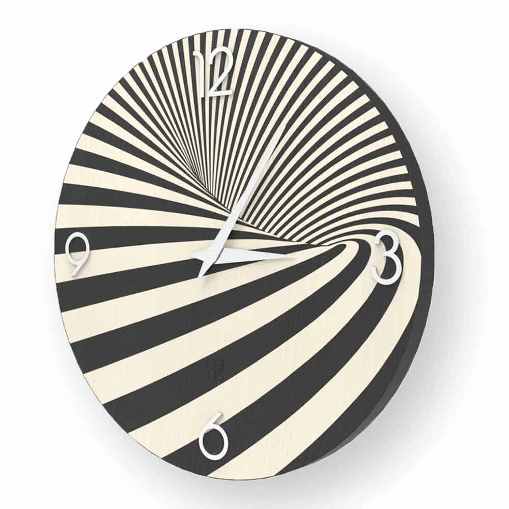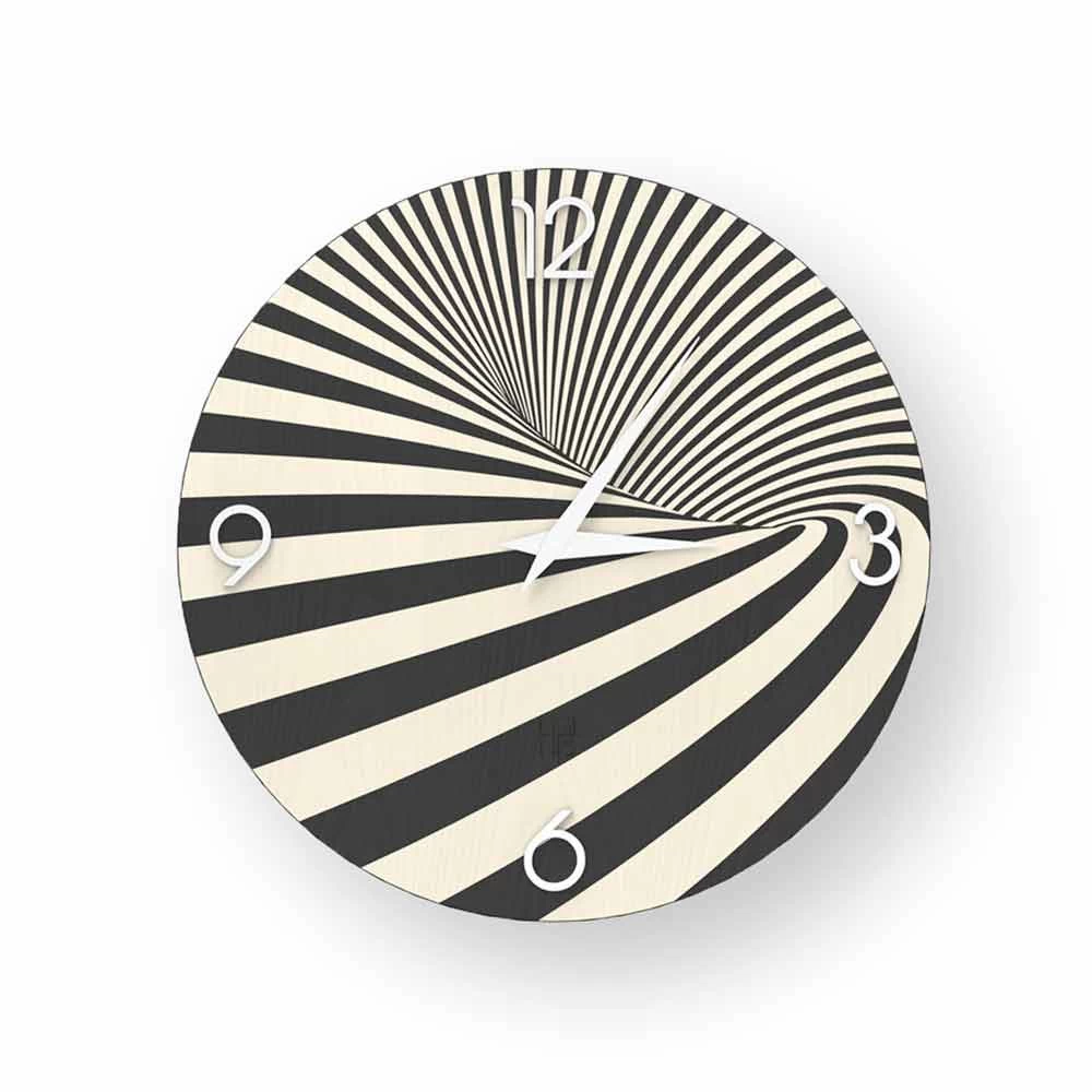 Azzio est une horloge murale où les formes, les couleurs et les lignes se mélangent, rappelant l’art d’Azzio et recréant par conséquent des jeux d’illusion d’optique uniques en son genre.