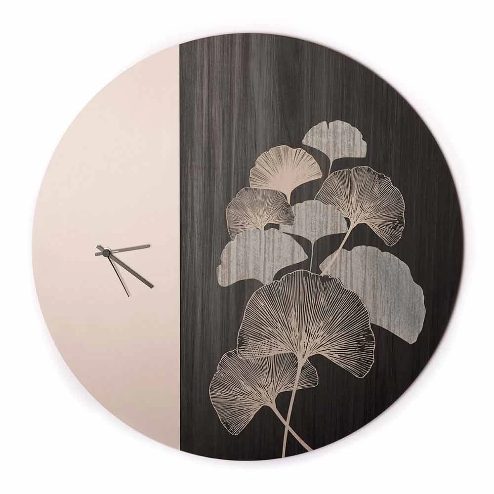 Inspirée des forêts orientales de ginkgo, cette horloge murale en bois à l’ âme exotique se caractérise par la décoration marquée au laser qui représente le dessin stylisé des fleurs et de leurs veines de cette plante caractéristique. La forme ronde se combine avec la sinuosité de la flore et des couleurs douces, pour donner vie à un design élégant, sophistiqué et intemporel.