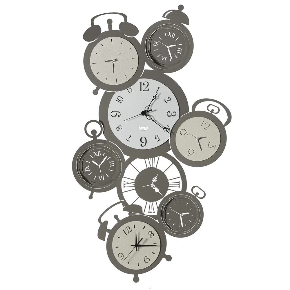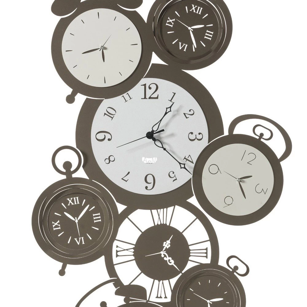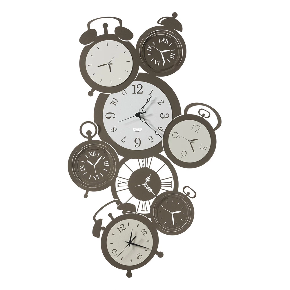 Cette horloge murale se caractérise par le design original composé de 8 cadrans de styles différents , tant en forme qu’en couleur et en nombre. Dans certains, en effet, la numérotation arabe est utilisée, dans d’autres la numérotation romaine . Entièrement réalisé en fer , c’est un meuble adapté à la décoration d’un grand mur grâce à son développement vertical.