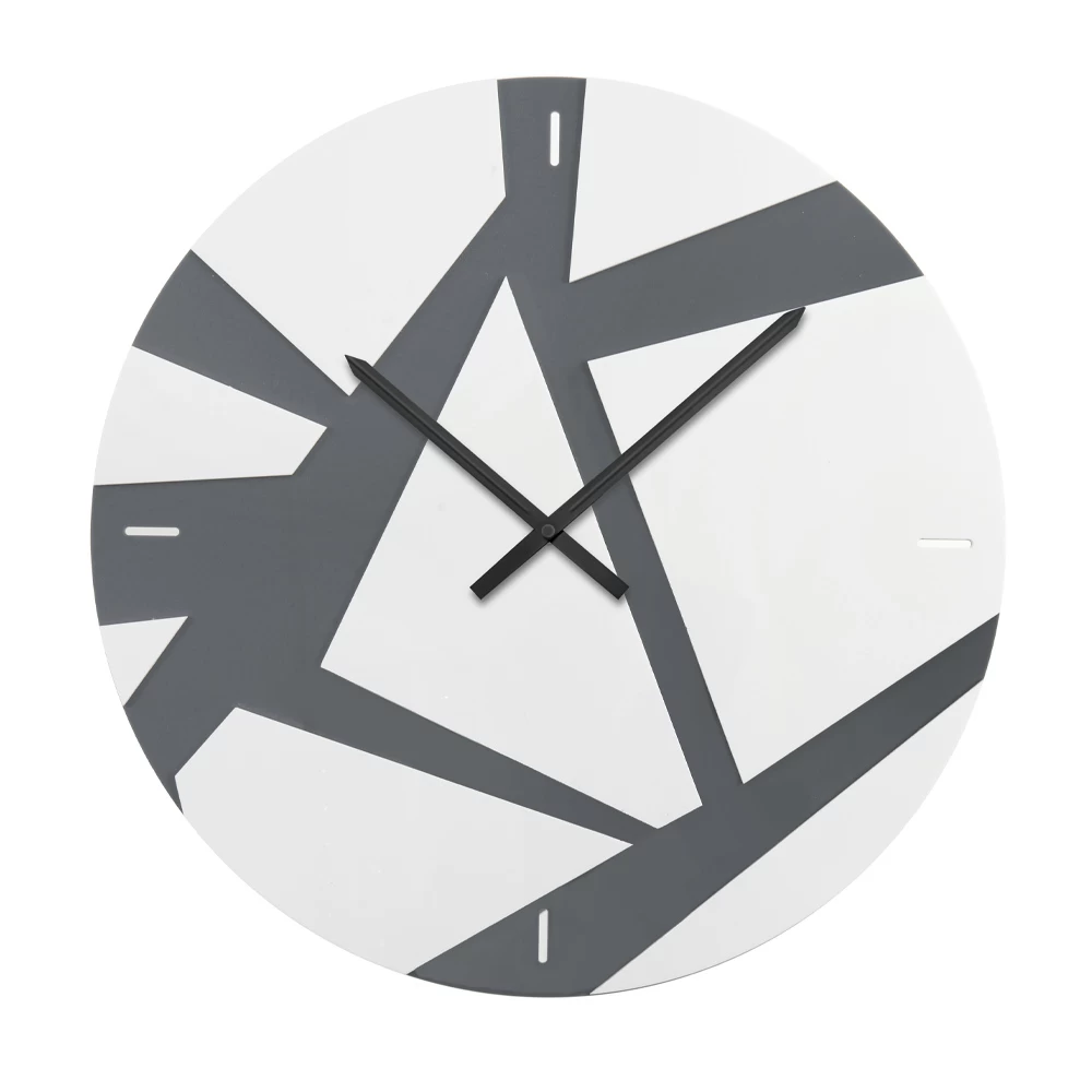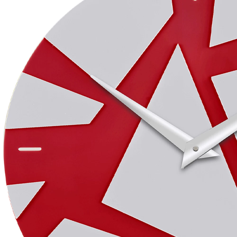 Cette horloge murale au design rond se caractérise par son jeu suggestif de géométries créées par le chevauchement et la combinaison de deux éléments en plexiglas de couleurs différentes.