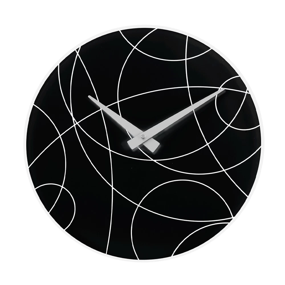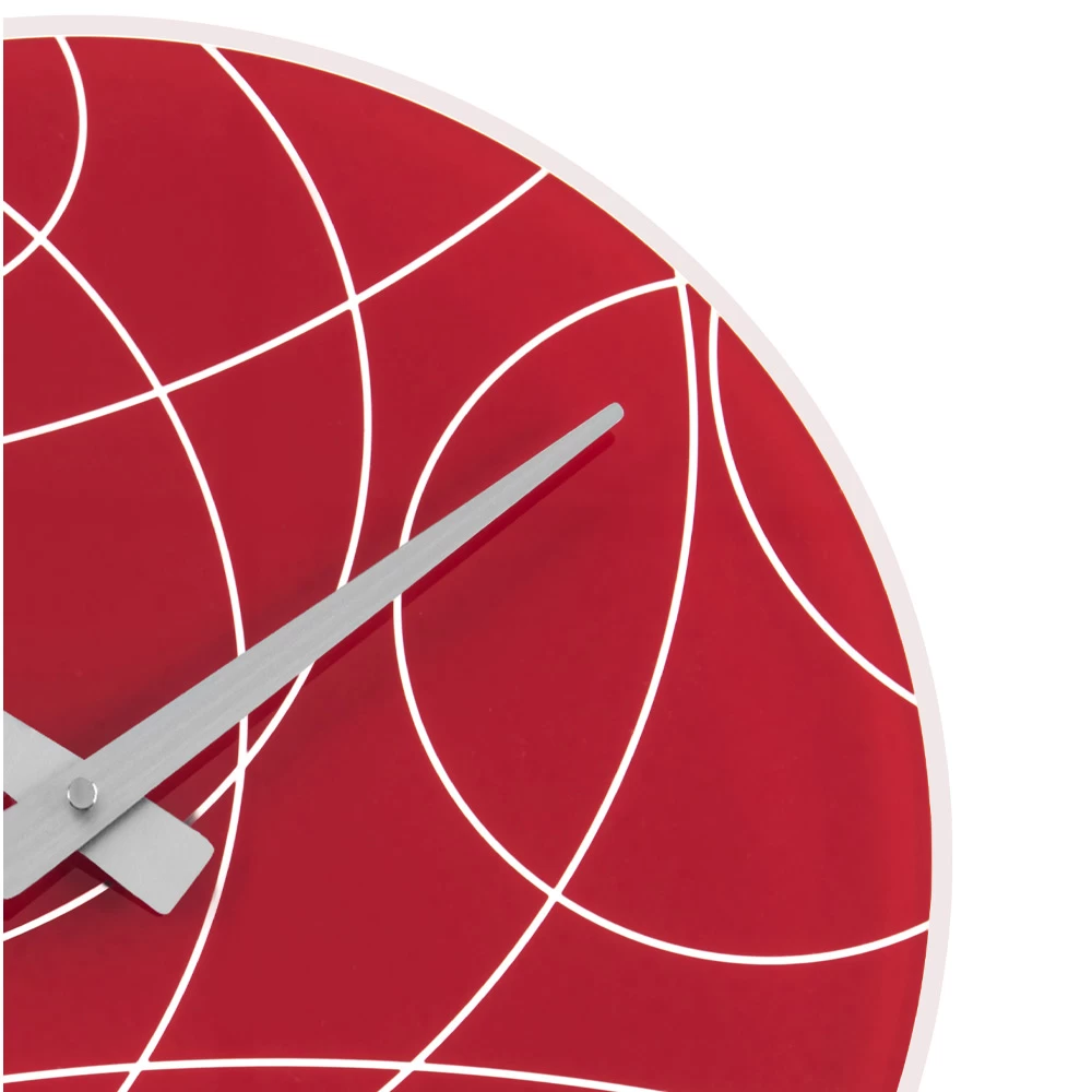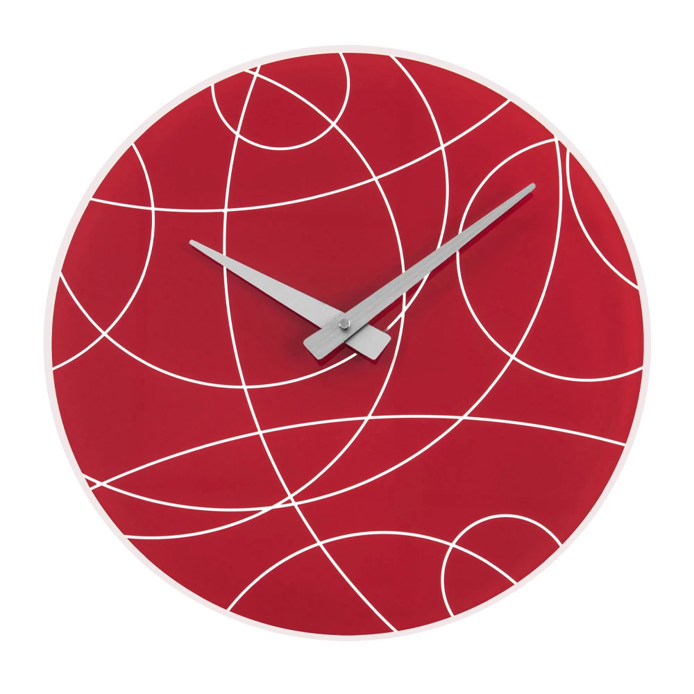 Horloge murale ronde en plexiglas coloré et lignes courbes de décoration, fabriquée en Italie.