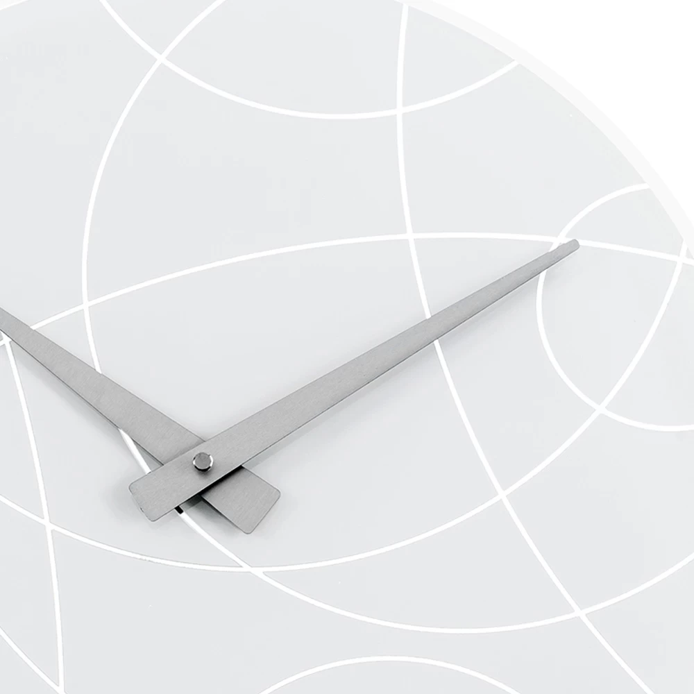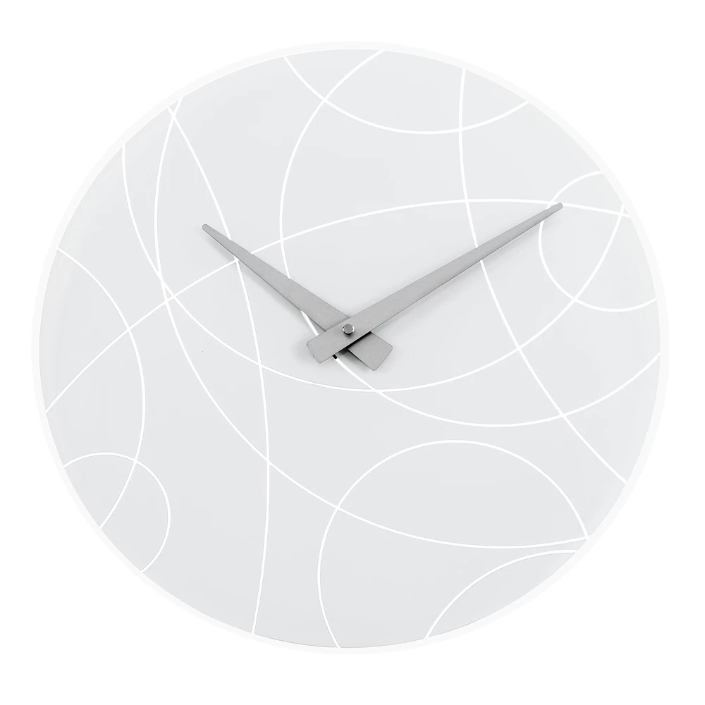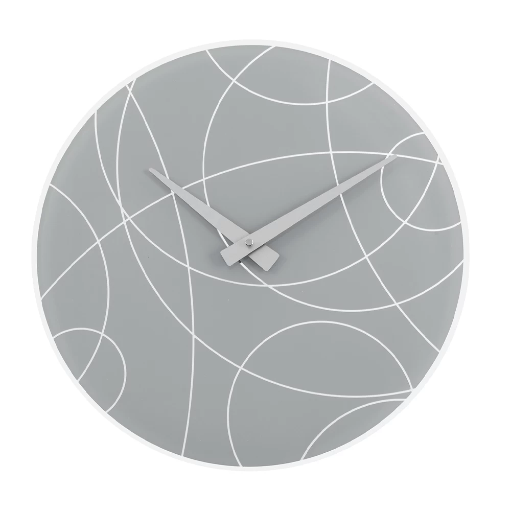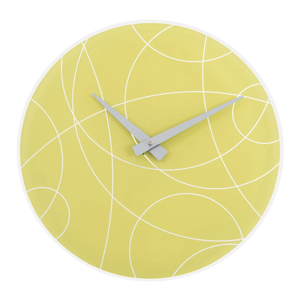 Horloge murale ronde en plexiglas coloré et lignes courbes de décoration, fabriquée en Italie.