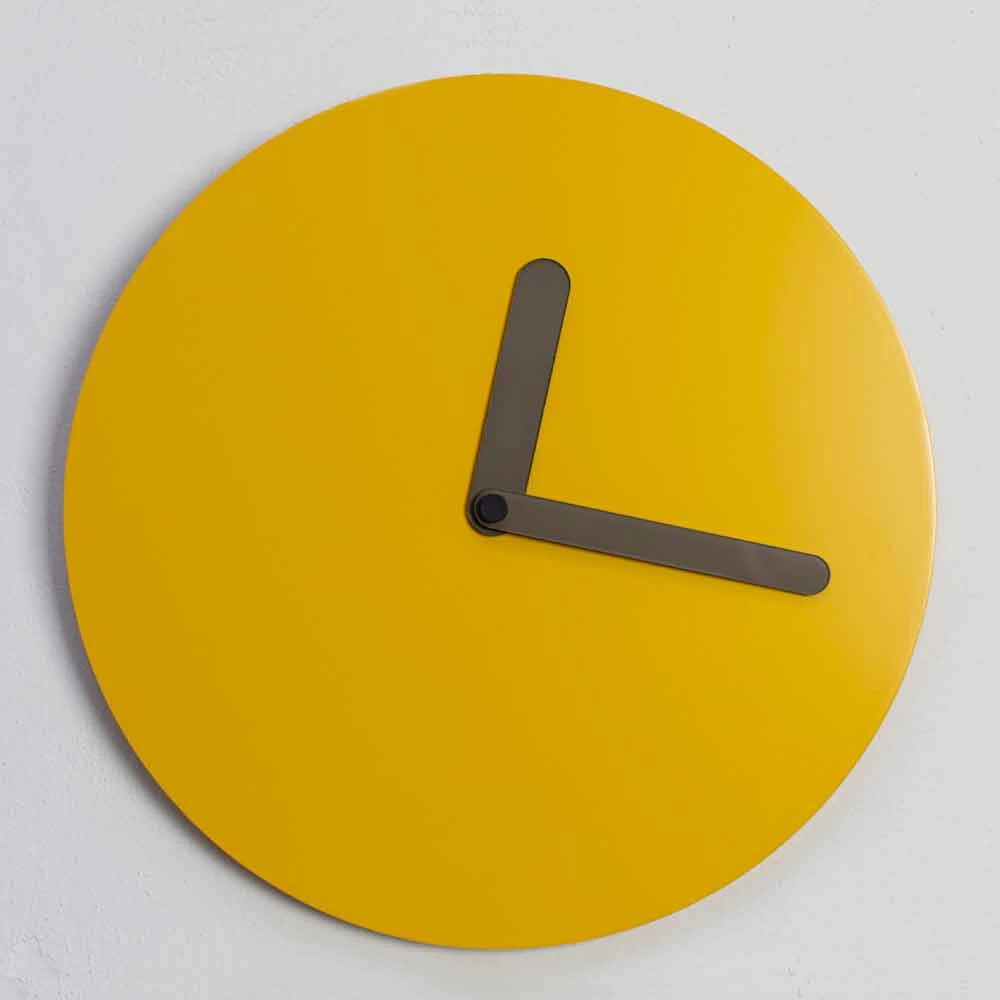 Horloge murale de design moderne ocre et gris tourterelle, fabriquée en bois rond fabriqué en Italie.