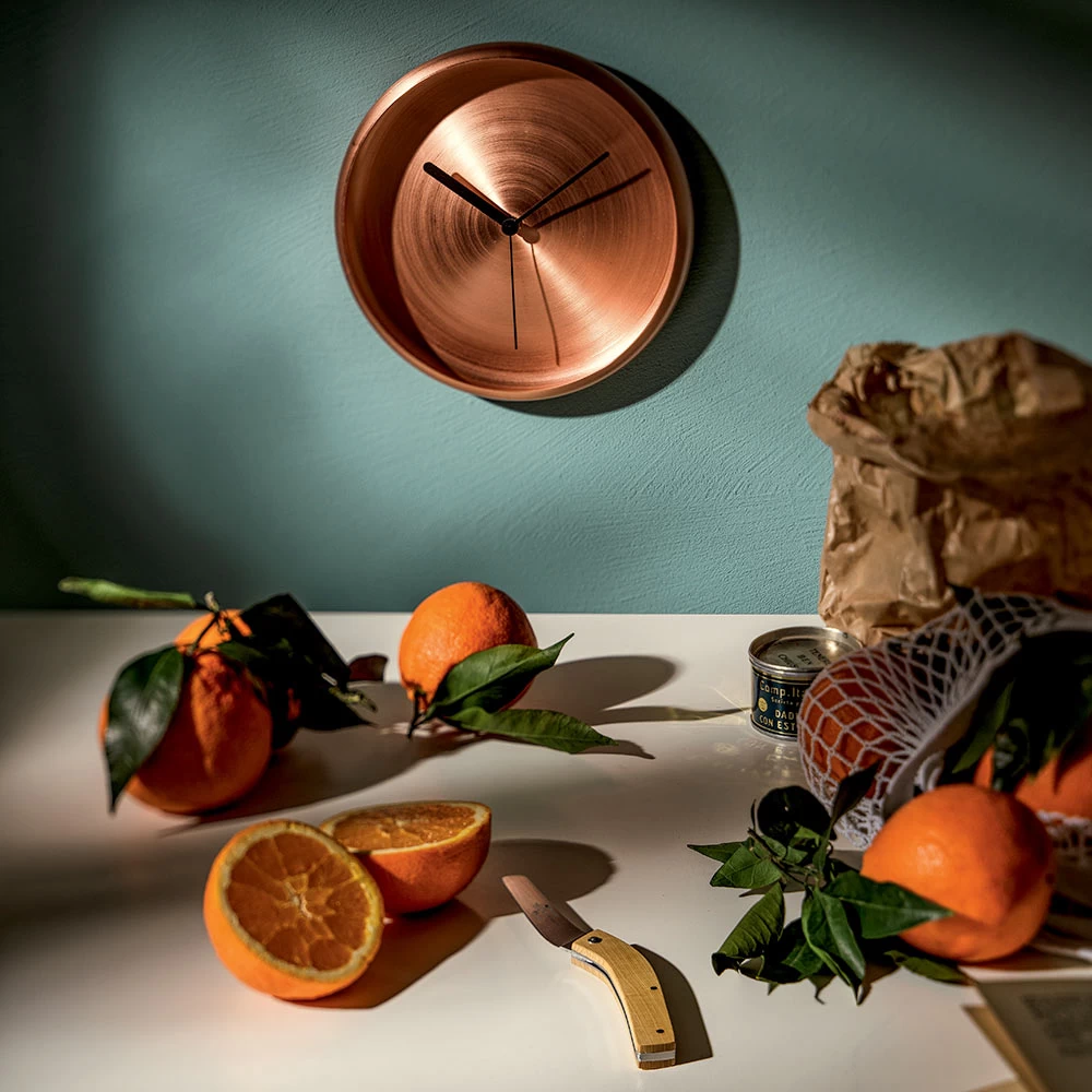 Ogio est une magnifique horloge murale ronde caractérisée par un design contemporain qui rappelle les anciennes cuisines italiennes où les murs étaient recouverts de pots et de plats en cuivre.