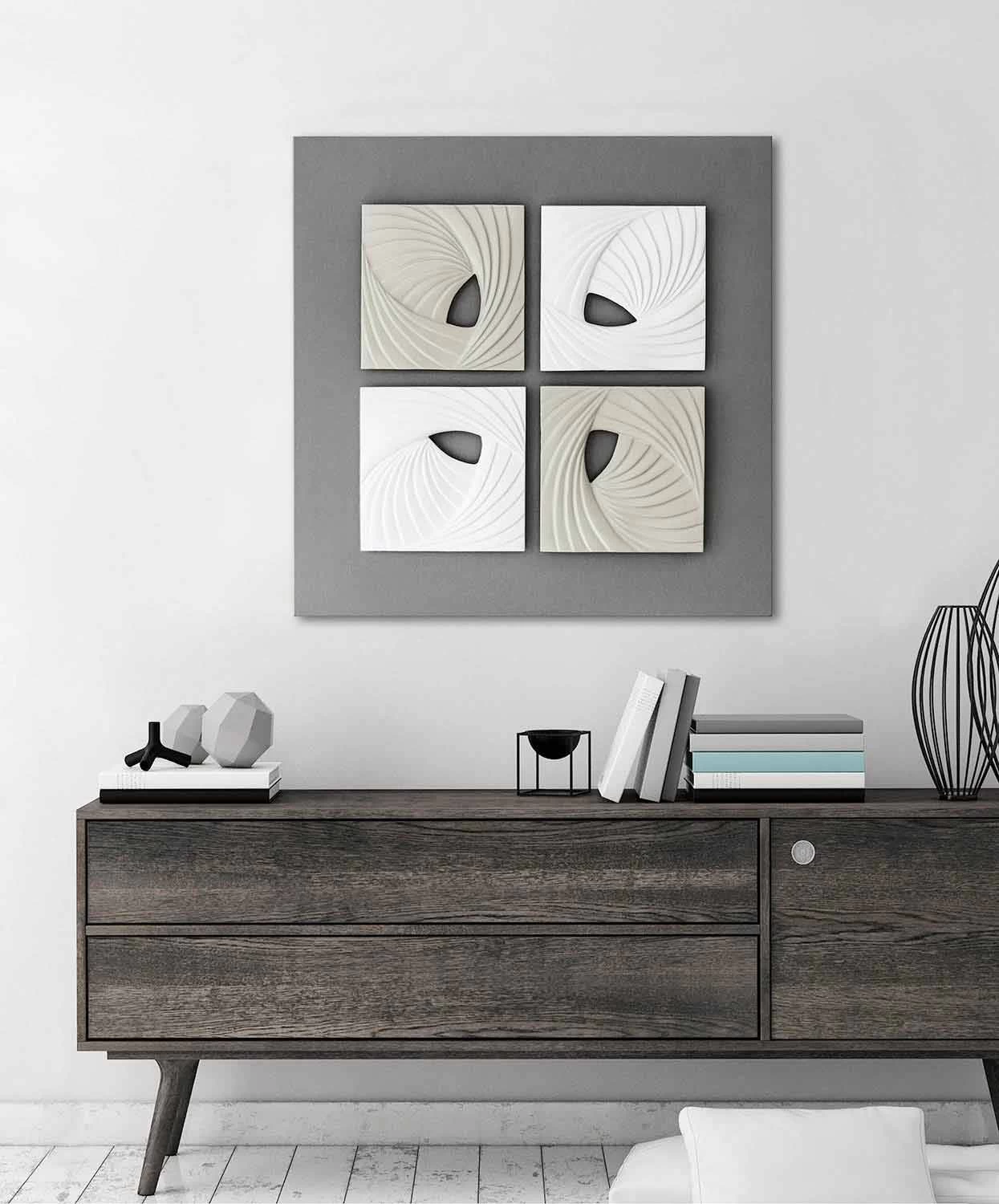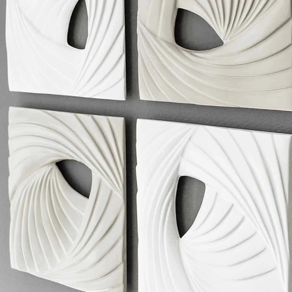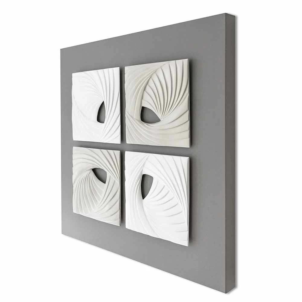 Décoration murale design moderne en bas-relief en céramique blanche et grise surplombant sur toile, fabriquée en Italie.