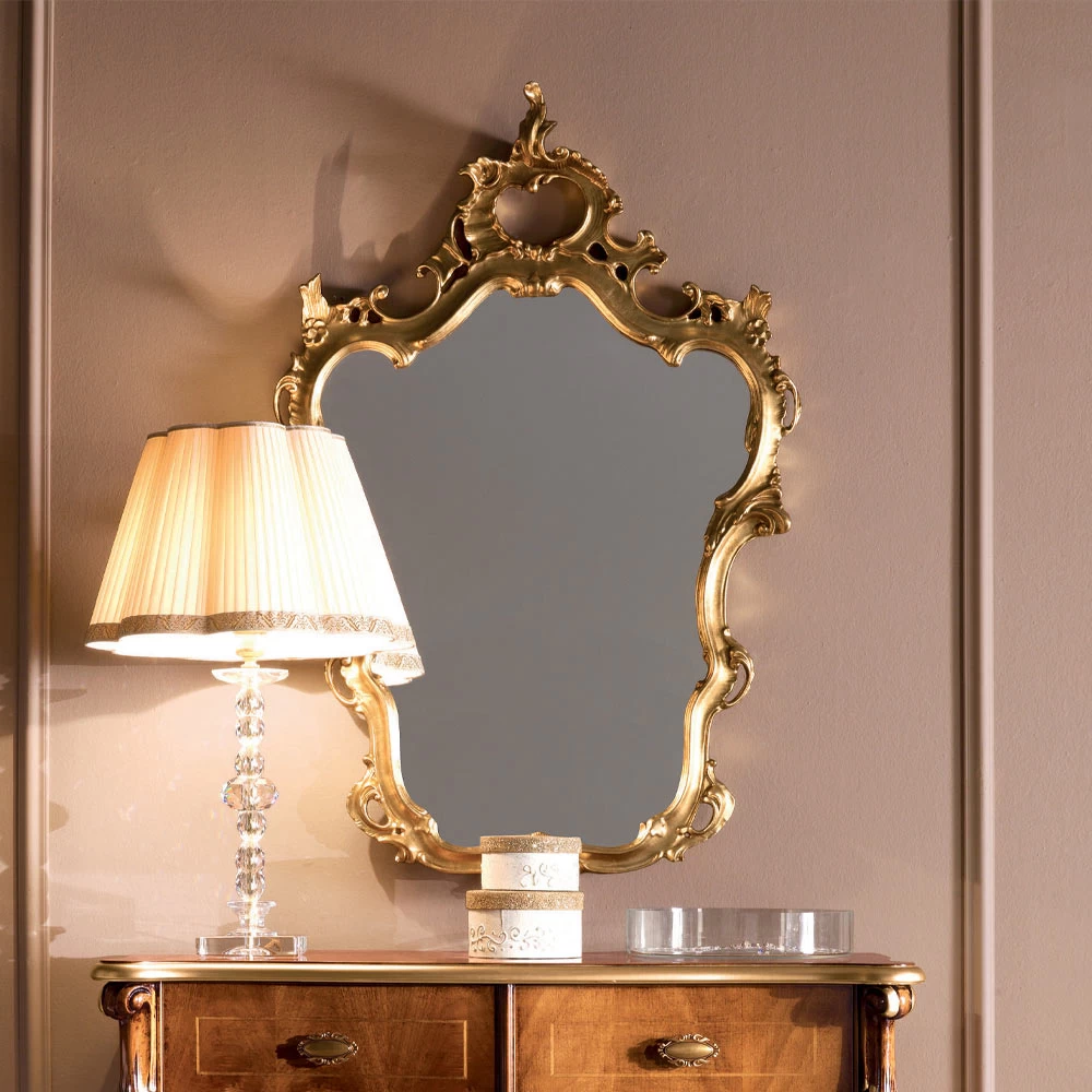 Miroir de style classique avec cadre en forme fini à la feuille d’or , idéal pour décorer n’importe quel environnement avec personnalité et originalité. Un complément unique et raffiné, entièrement fabriqué en Italie par des maîtres artisans qualifiés , des maîtres d’art qui finissent chaque complément avec sagesse et goût pour l’élégance. La production est réalisée en utilisant des matériaux nobles et en réalisant le travail à la main avec le plus grand soin et le professionnalisme qui distinguent les produits Made in Italy .