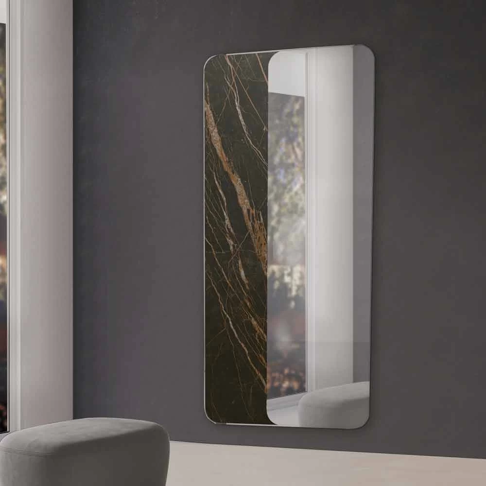 Miroir mural entièrement fabriqué en Italie composé d’un anneau extérieur en métal et d’un insert latéral en céramique ou en bois complété par un miroir superposé en finition bronze ou argent. Un design moderne et raffiné caractérisé par toute la qualité et l’excellence du véritable Made in Italy qui vous permet de créer un accessoire d’ameublement exclusif et avant-gardiste, idéal pour enrichir votre intérieur avec style et personnalité. Le résultat est un miroir extrêmement élégant qui, en plus de compléter le mobilier avec une touche de classe, contribue à agrandir optiquement les espaces en donnant plus de lumière à l’environnement, démontrant une excellente fonctionnalité ainsi qu’un design raffiné et innovant .