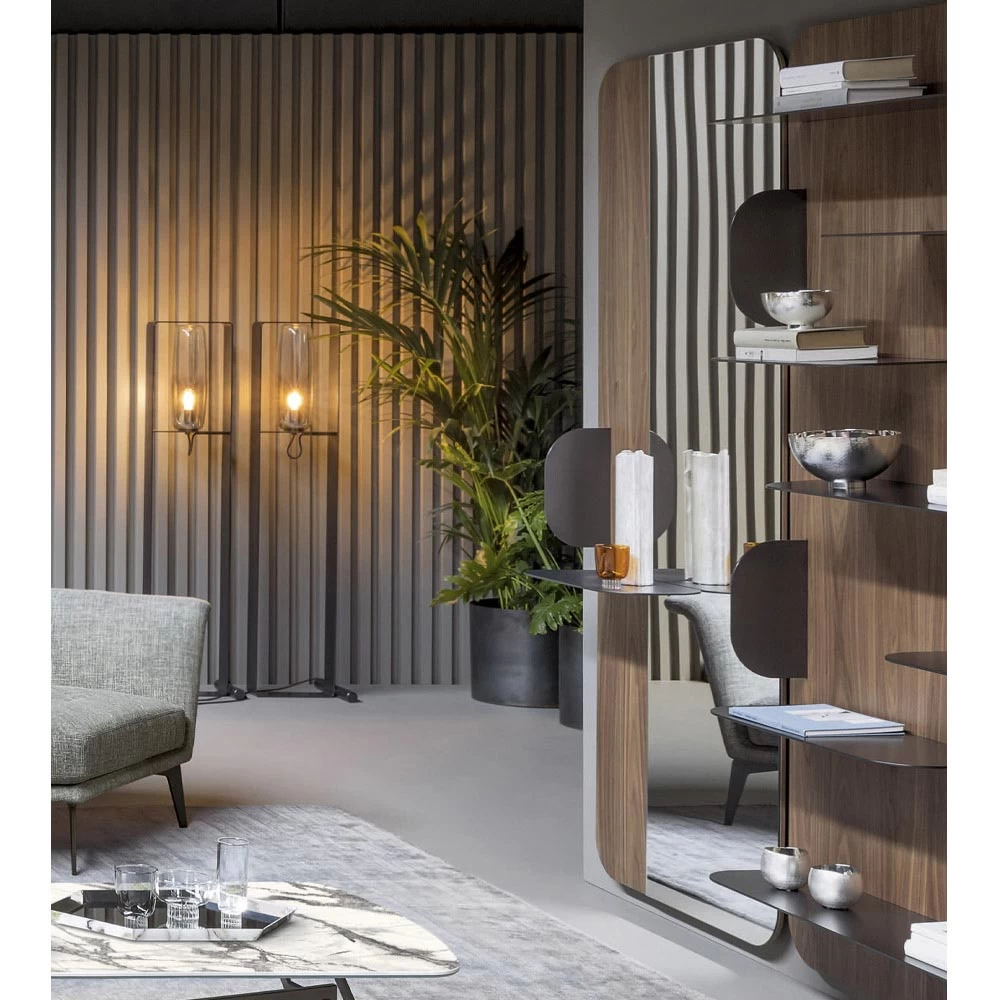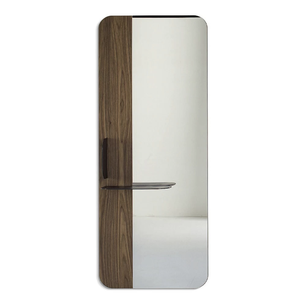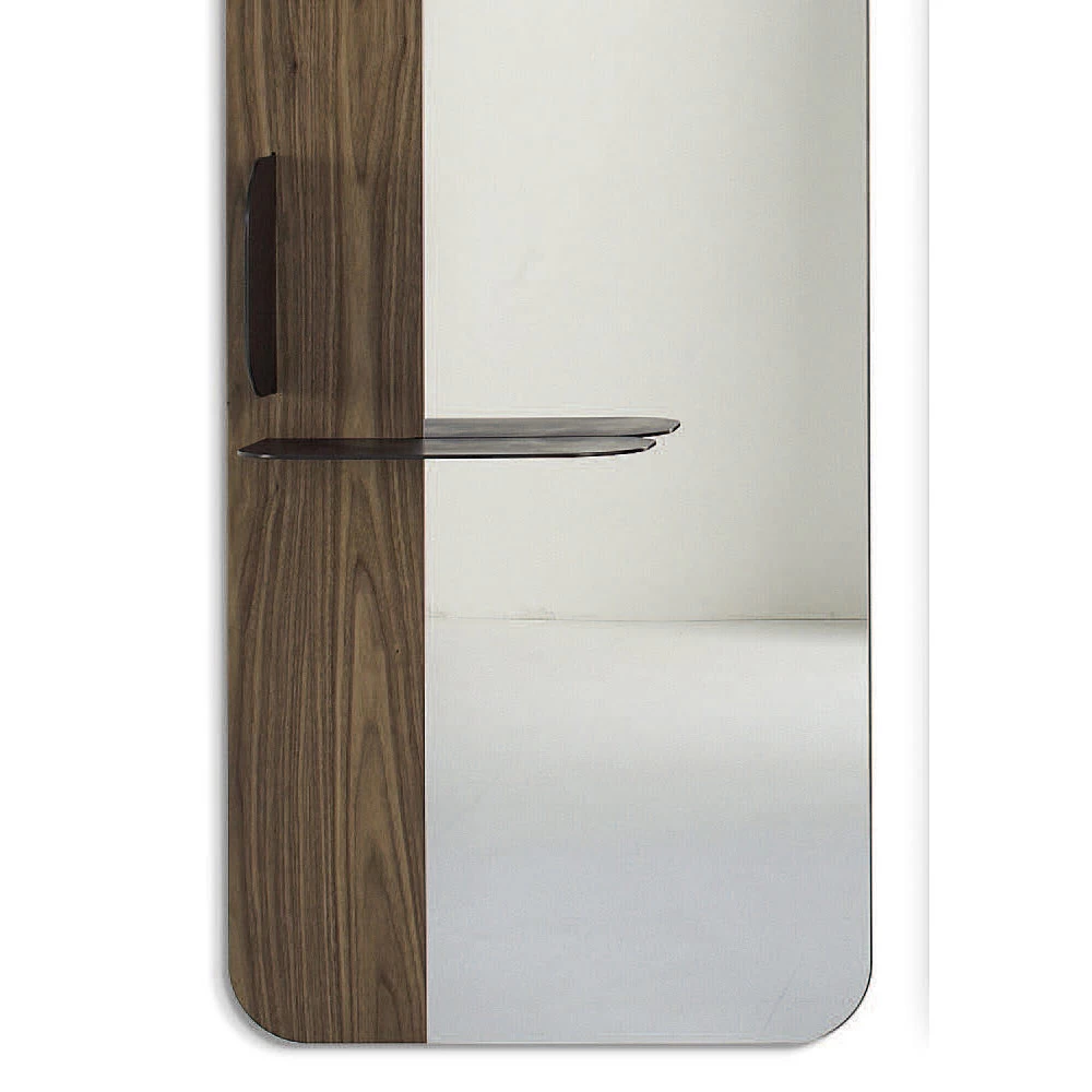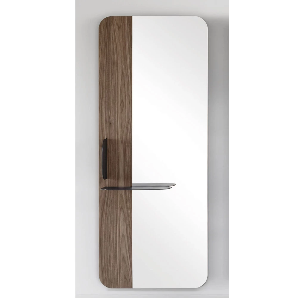 Miroir mural fabriqué en Italie avec structure en bois plaqué et étagère en métal . Une solution fonctionnelle avec une esthétique informelle qui est particulièrement adaptée pour meubler votre entrée de manière élégante et originale, agissant également comme un vide-poche pratique . L’élément qui enrichit le design de ce produit est le profil arrondi de la structure et l’étagère qui complète la silhouette avec une touche raffinée et innovante . Ce qui est né est un miroir à la personnalité créative et raffinée , capable d’offrir un meuble pratique tout en complétant le mobilier environnant grâce à son fort caractère moderne et son âme sophistiquée .