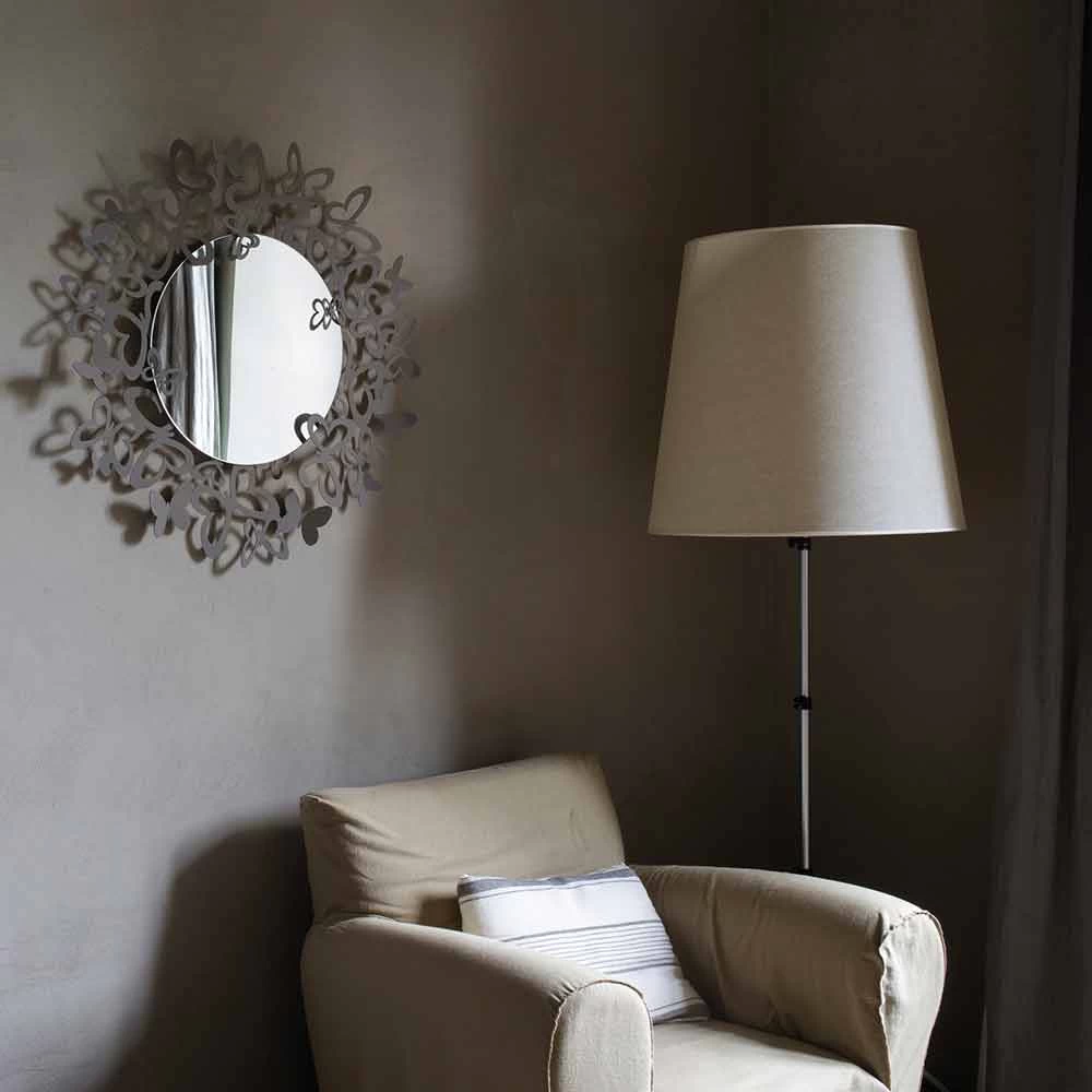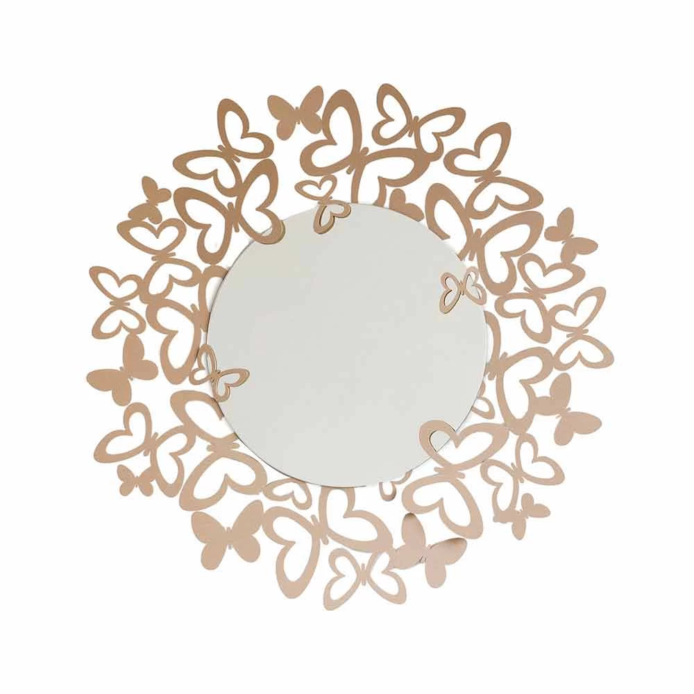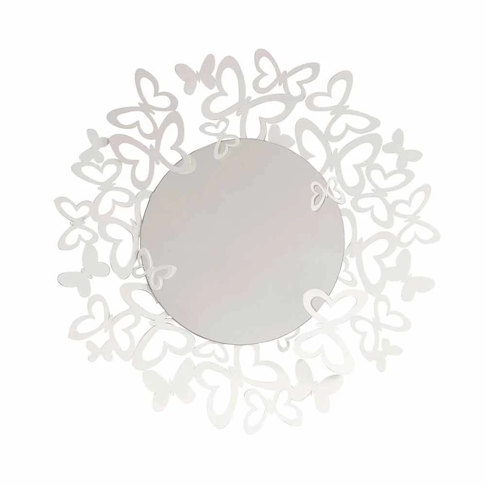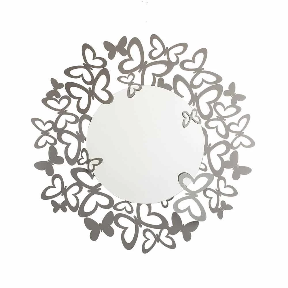 Le miroir mural circulaire Stelio est rendu unique et spécial par le traitement des bords qui représentent des groupes de papillons stylisés. Fait à la main en Italie, fer et sponibile en trois couleurs différentes: