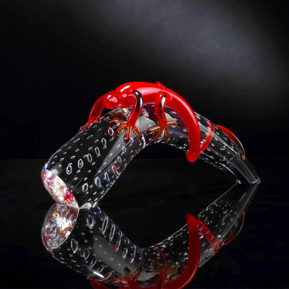Ornement en forme de gecko sur corne fabriqué en Italie en verre rouge et transparent . Un élément décoratif excentrique pour les espaces de votre maison capable de donner une touche originale grâce à sa forte personnalité créative . Son esthétique inhabituelle et colorée représente sans aucun doute son point fort, ce qui en fait une idée parfaite pour ceux qui aiment enrichir les environnements de la maison d’une manière originale et élégante à la fois grâce à un objet souligné par des lignes exclusives et l’élégance intemporelle du verre et ses magnifiques couleurs. Le résultat est un simple accessoire décoratif pour la maison capable d’enrichir le style de n’importe quelle maison avec une touche de couleur grâce à son âme moderne et son design avant-gardiste .