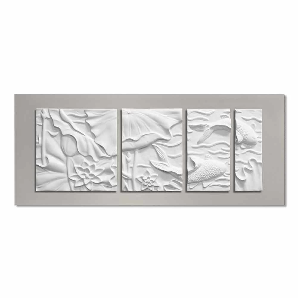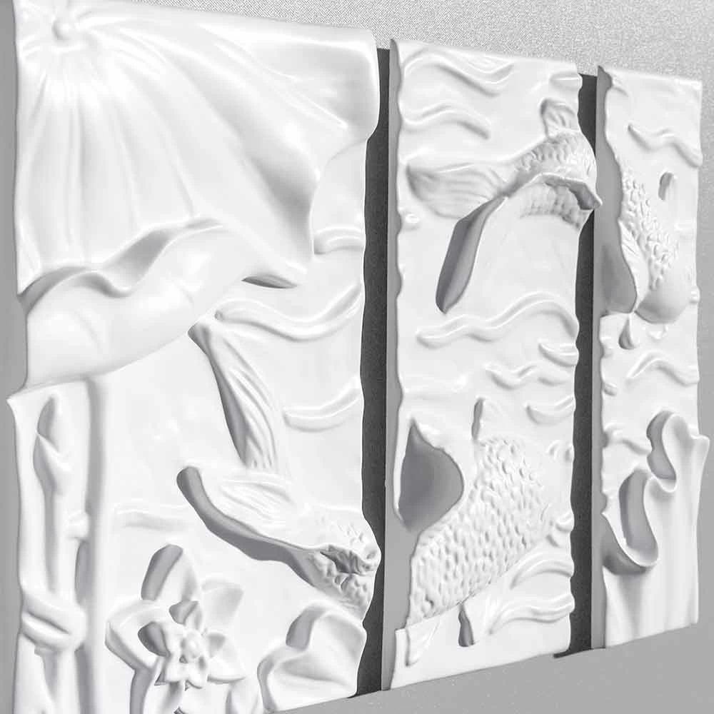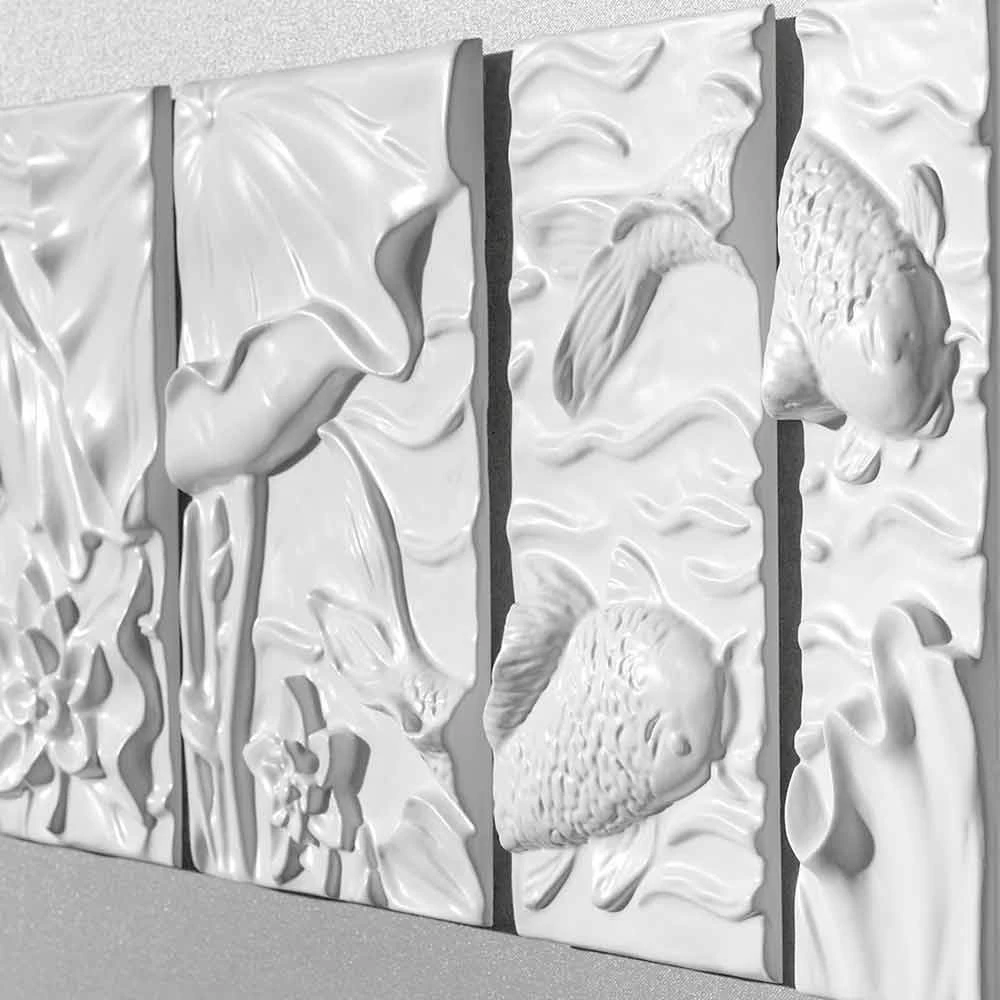Cette installation murale bas-relief décorée à la main en céramique composite est composée de quatre éléments aux lignes élégantes et aux formes modernes en blanc ivoire représentant la carpe koi japonaise montée en surplomb sur toile laquée gris soie. Le résultat est avec un impact esthétique minimal et décoratif, pour un style unique.