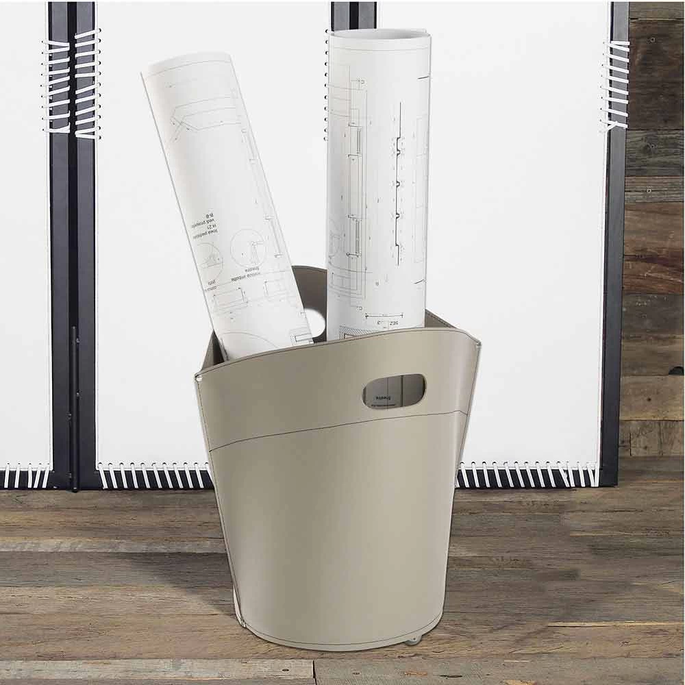 Sac à bûches en cuir, base en bois au sol avec roues en caoutchouc.