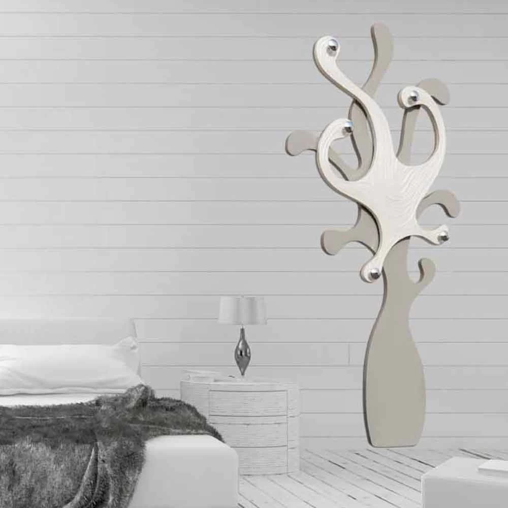 Le porte manteau Corey est caractérisé par deux éléments en bois MDF. L’élément inférieur est laquée en couleur taupe, la partie supérieur est décorés en effet nacre avec des détails en relief.