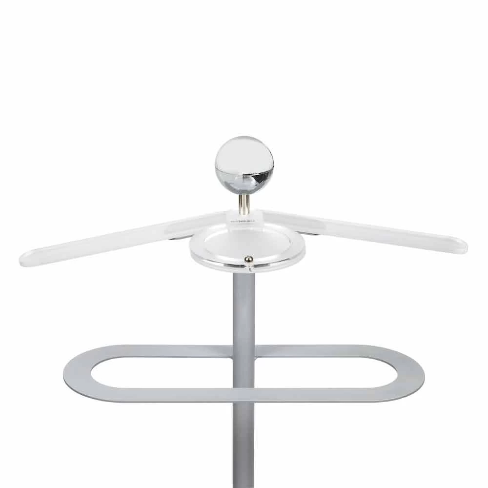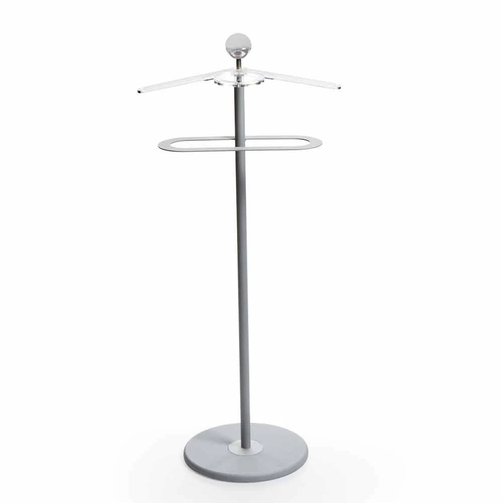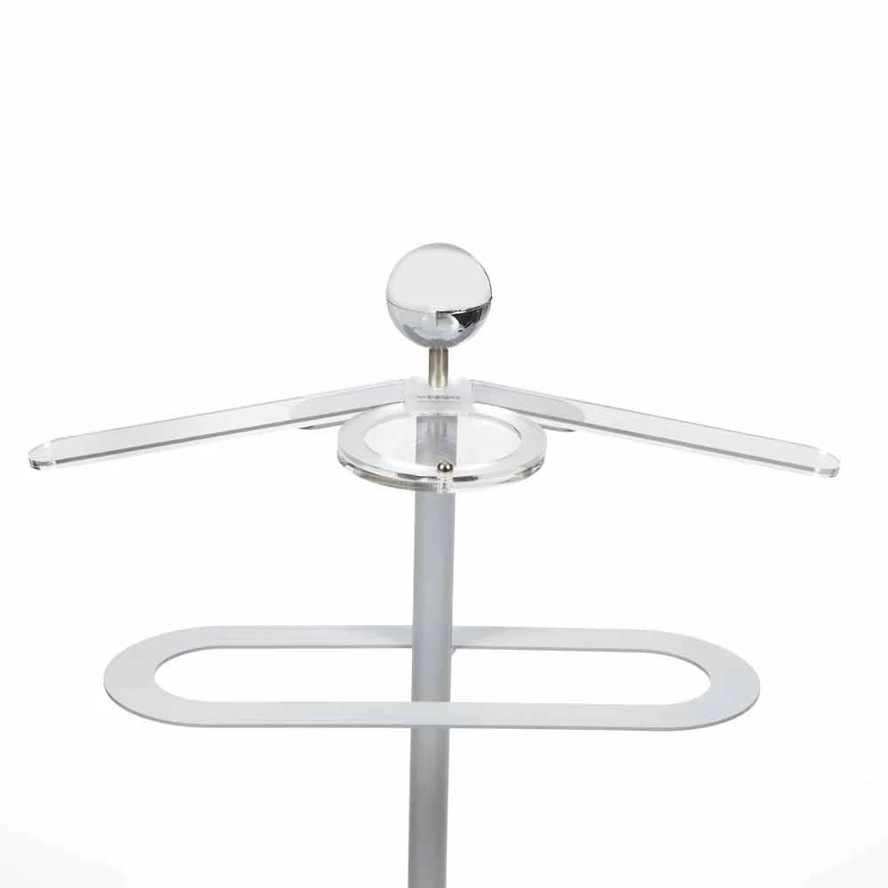 Porte-vêtement avec structure en métal peint de gris. Les détails sont en méthacrylate dans les couleurs transparent et satiné, finition chromée.