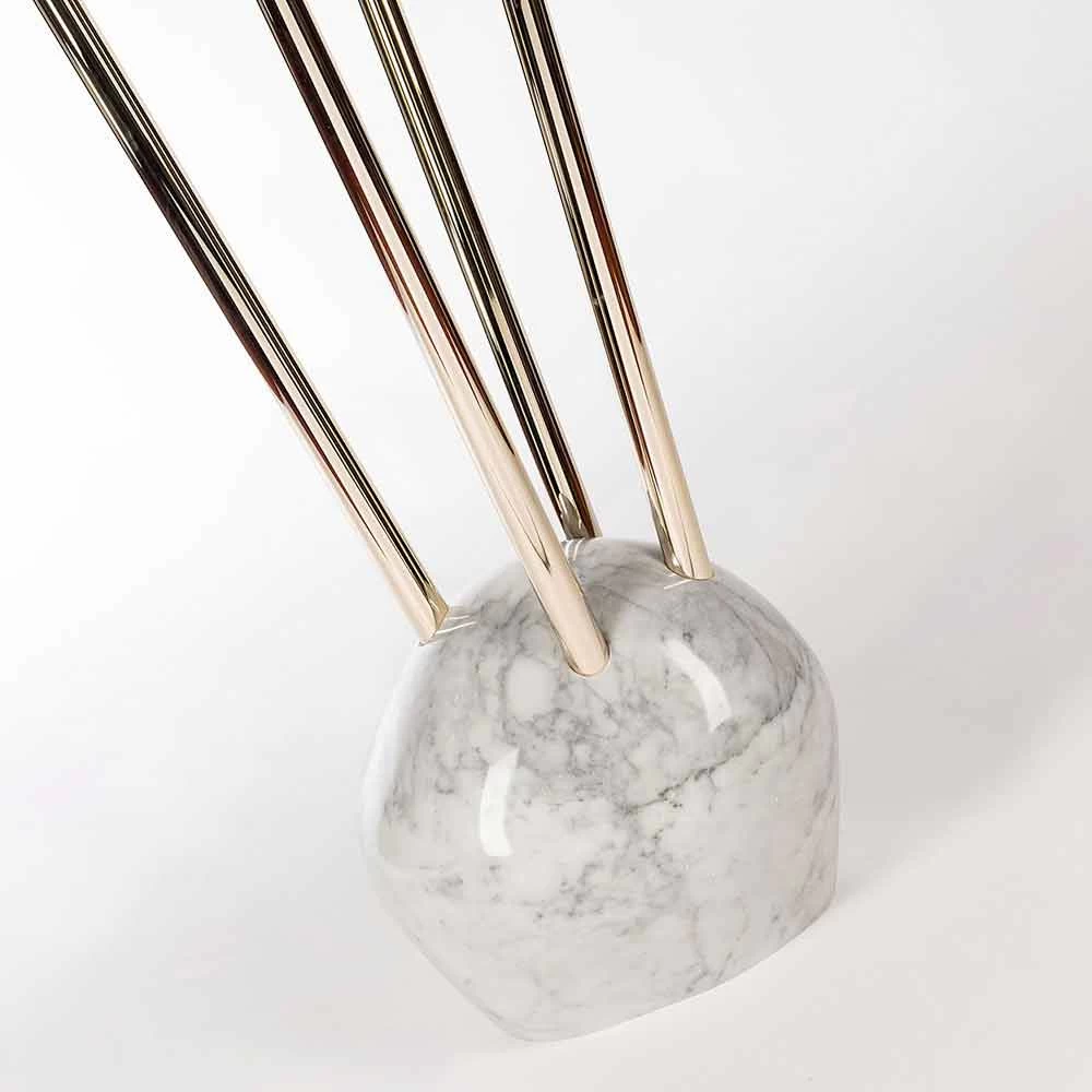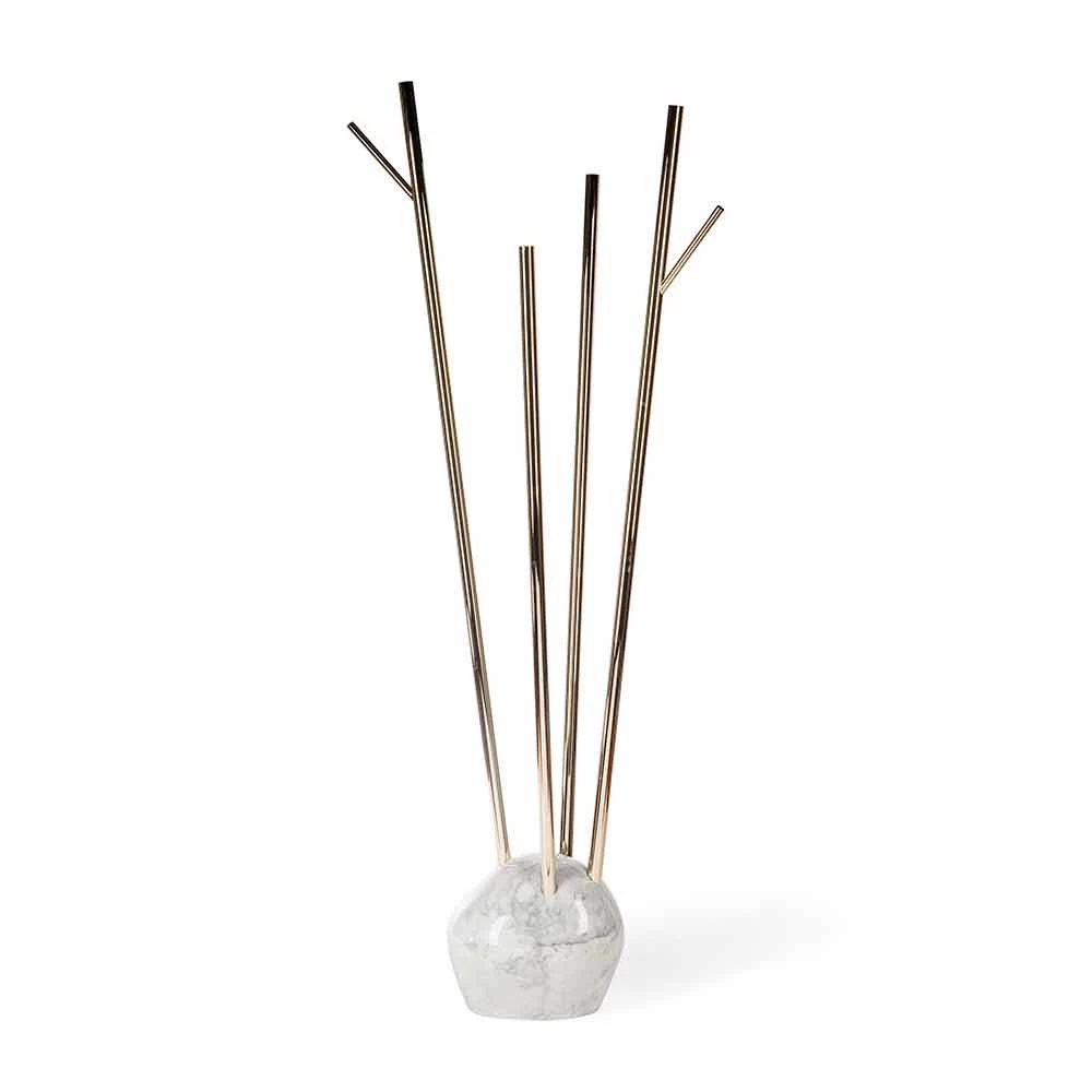 Portemanteau sur pied avec base en marbre blanc de Carrare et structure en métal galvanisé en finition or luisant 24 carats.