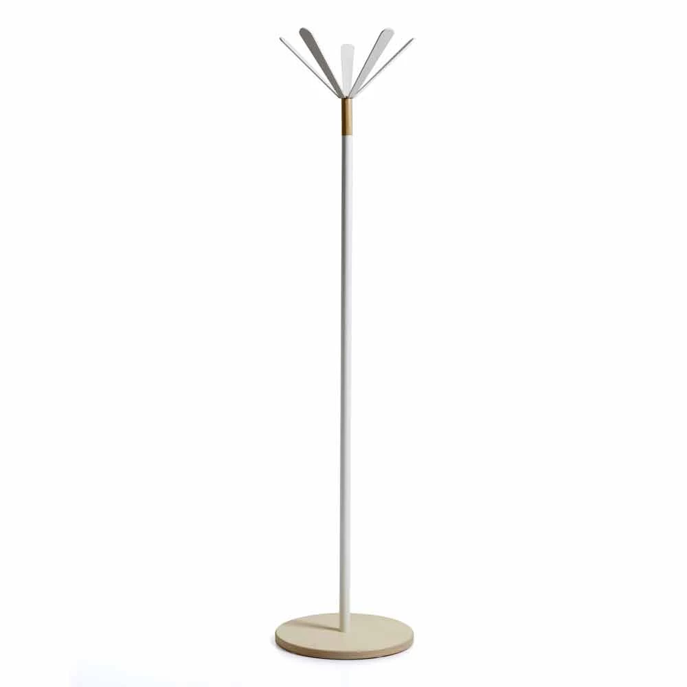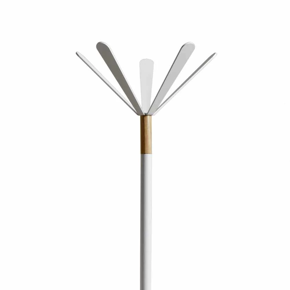 Cintre en métal peint en blanc, détails et base en bois naturel.