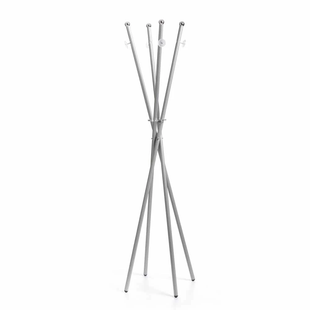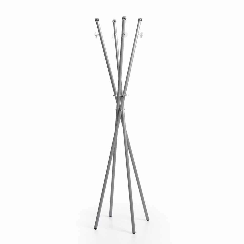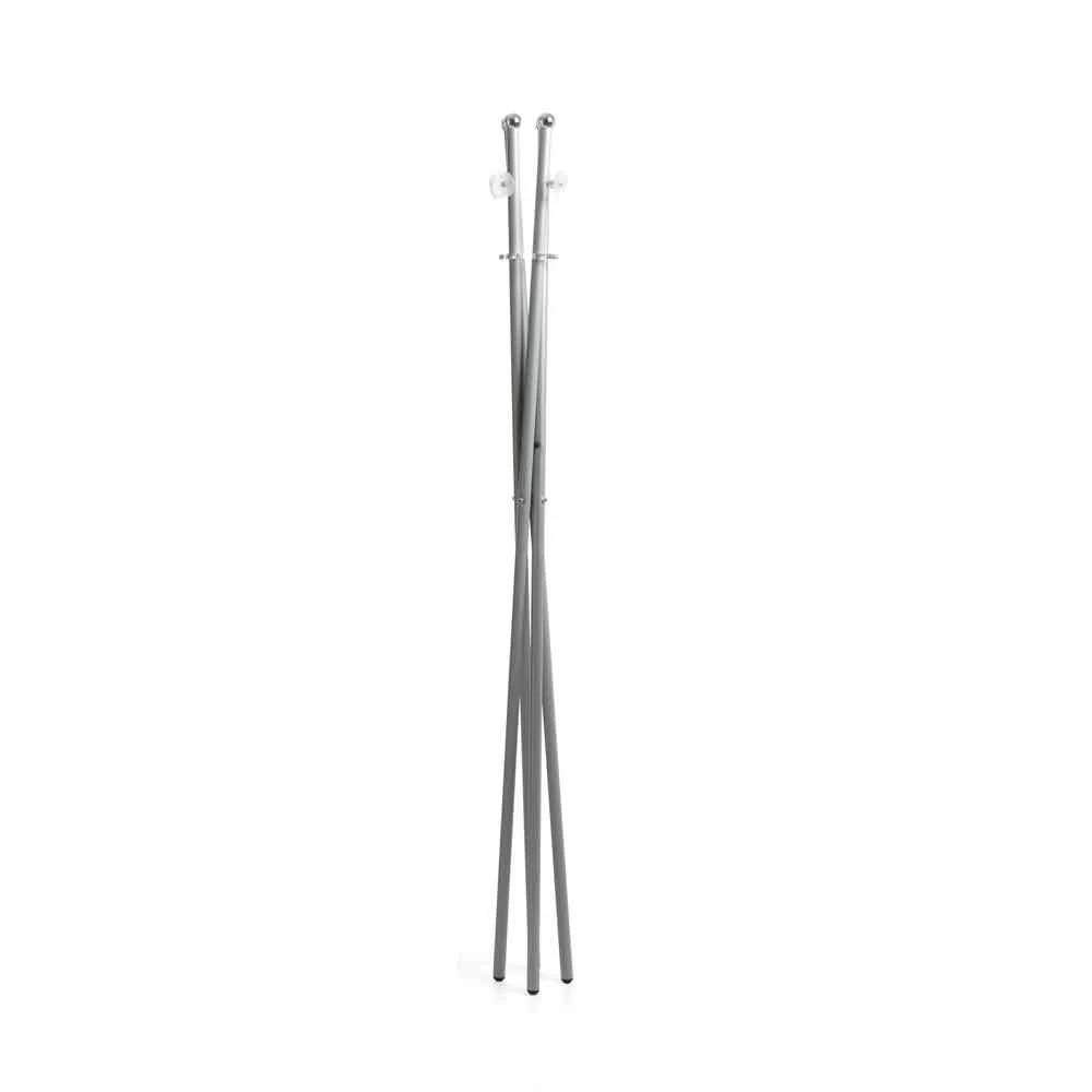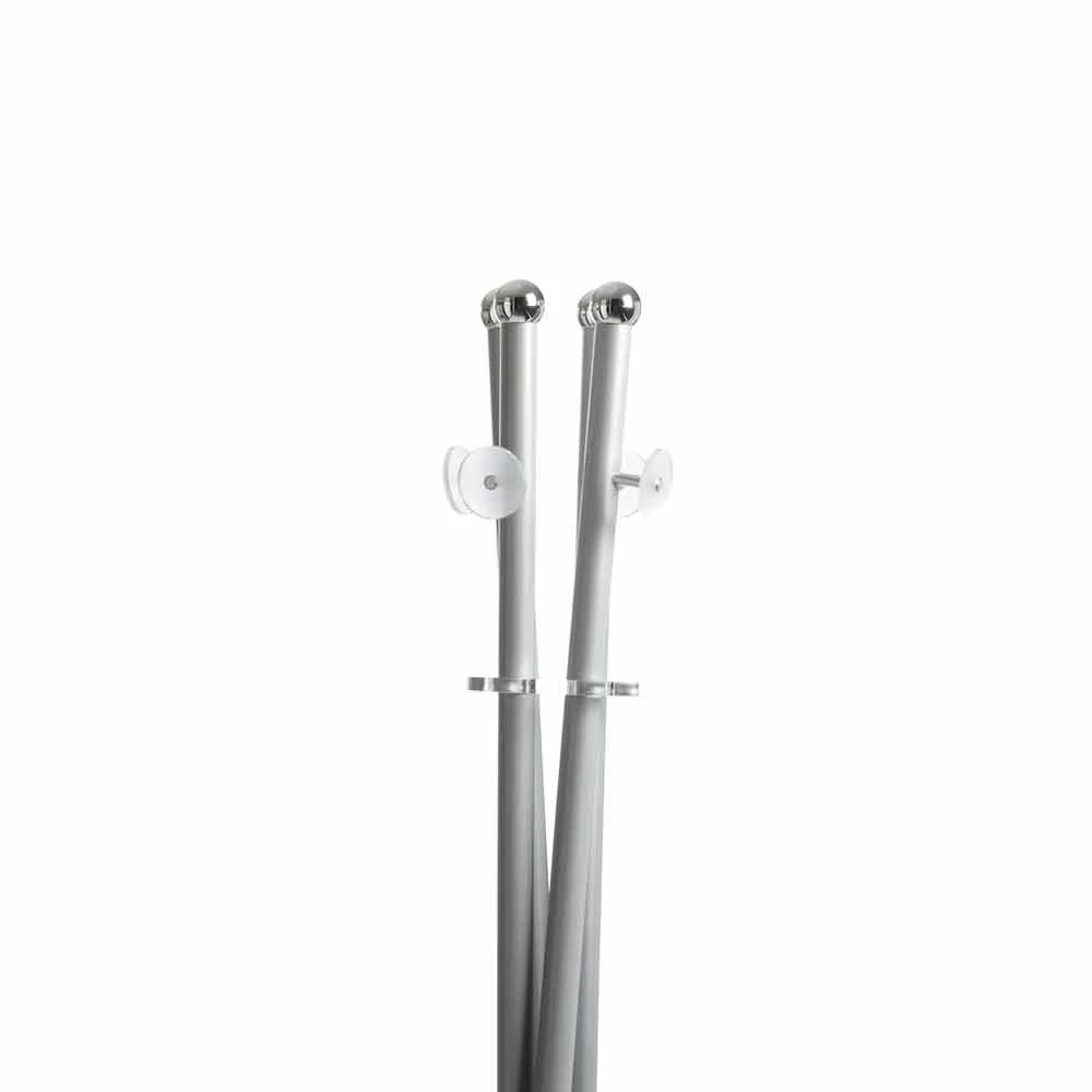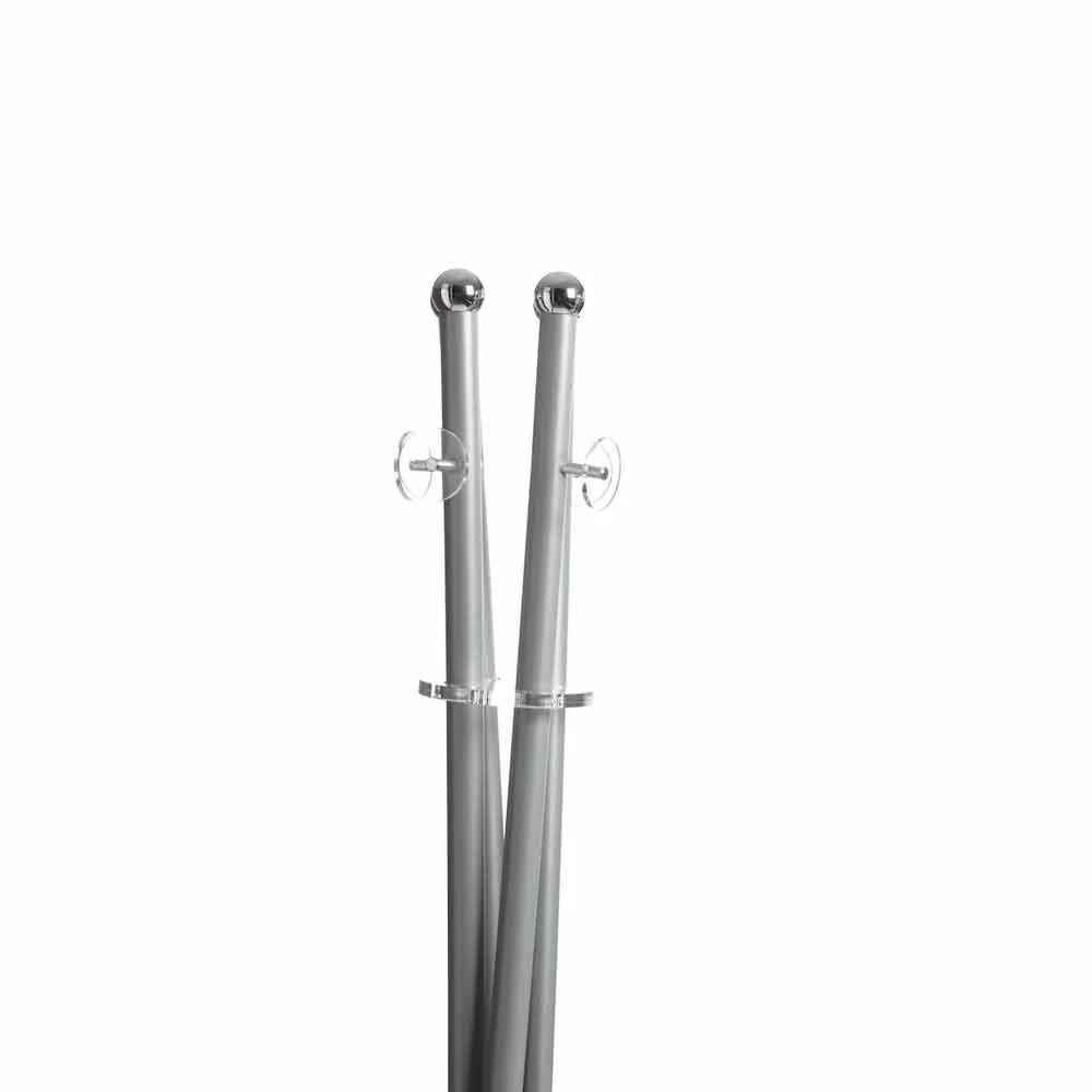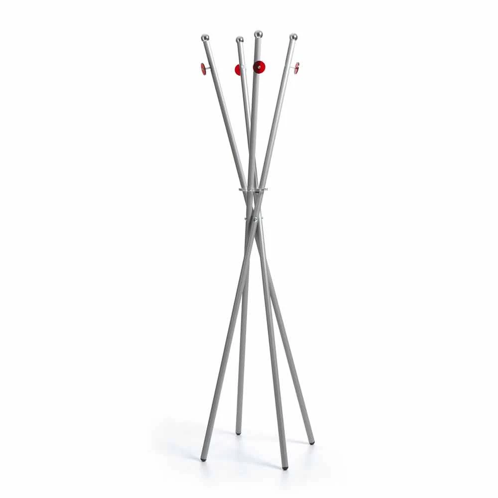 Tiges en métal peint gris. Support en méthacrylate transparent, détails en méthacrylate dans les couleurs rouge, transparent et satiné.