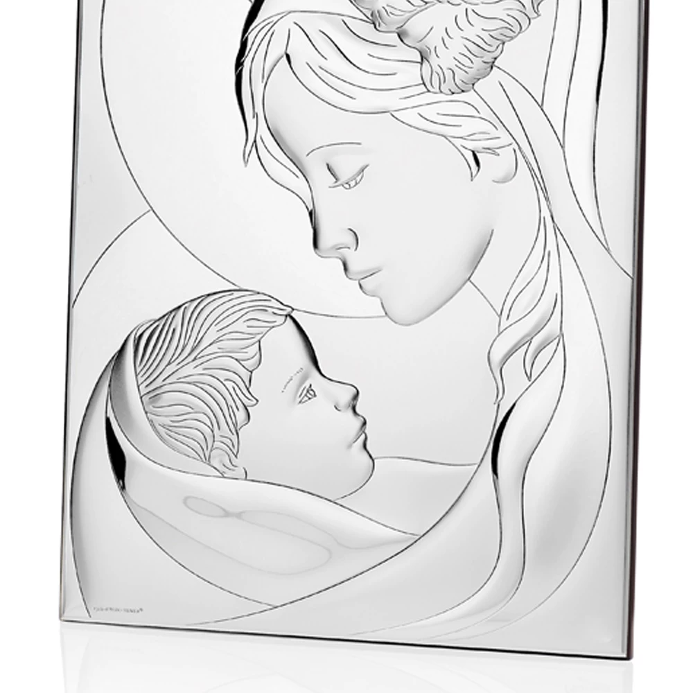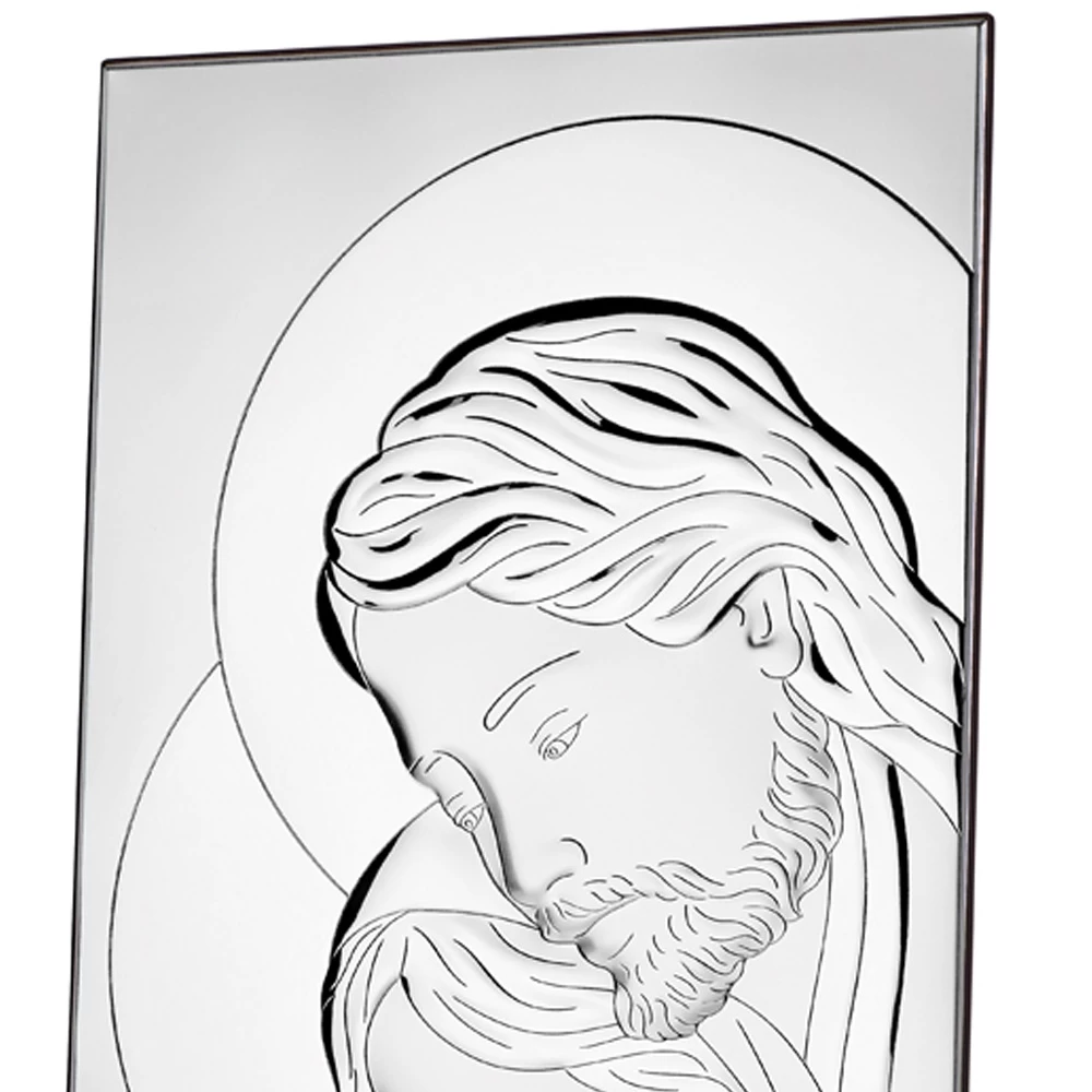 Cette icône sacrée rectangulaire gracieuse est fabriquée à partir du matériau innovant en argent miro et en bois de wengé à l’arrière grâce à un traitement manuel totalement italien qui implique l’utilisation de métaux précieux et de matériaux de première qualité avec des technologies de pointe.