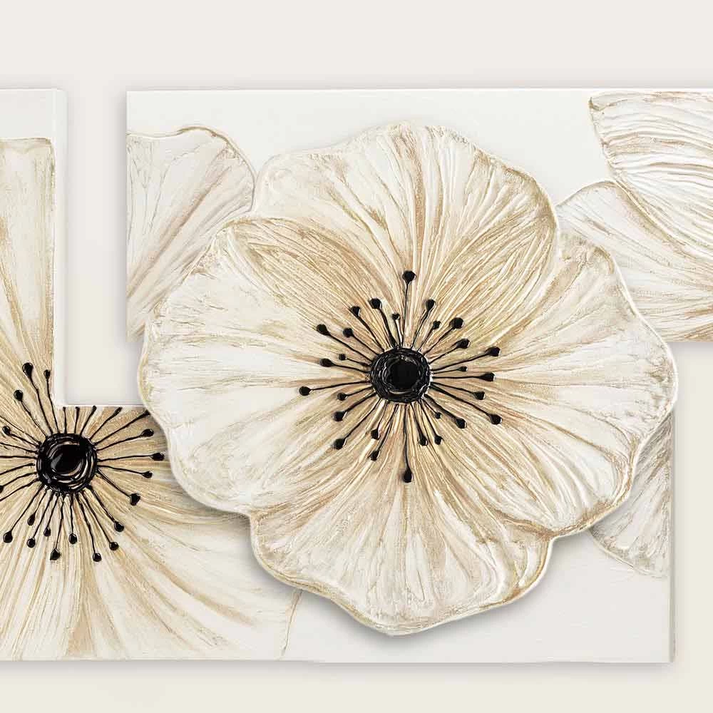Composition florale sur toile, décoré à la main avec détails de résine. L’ élément central est en relief. La finition est brillante.