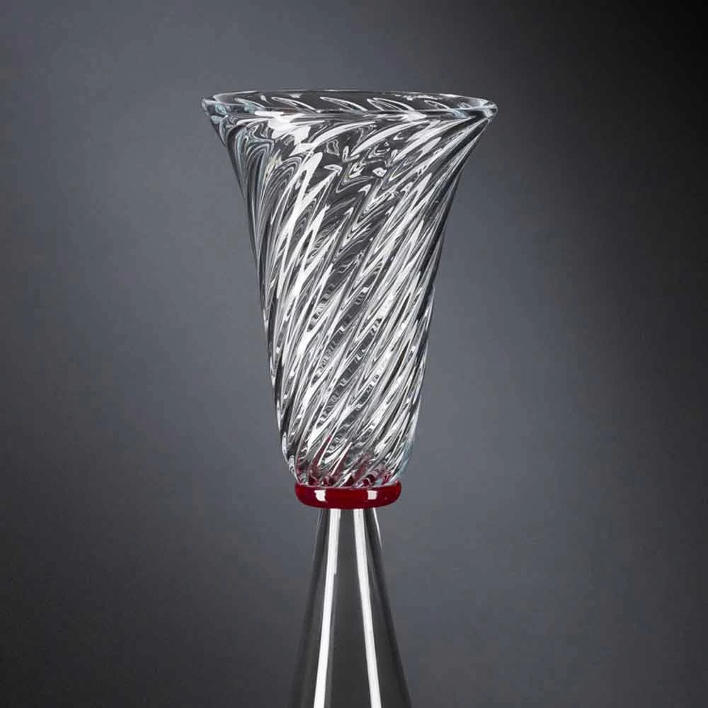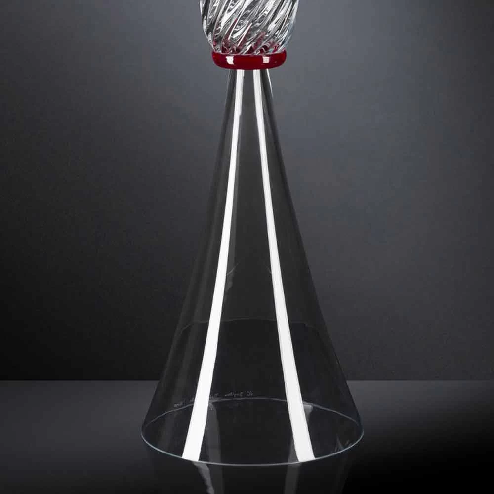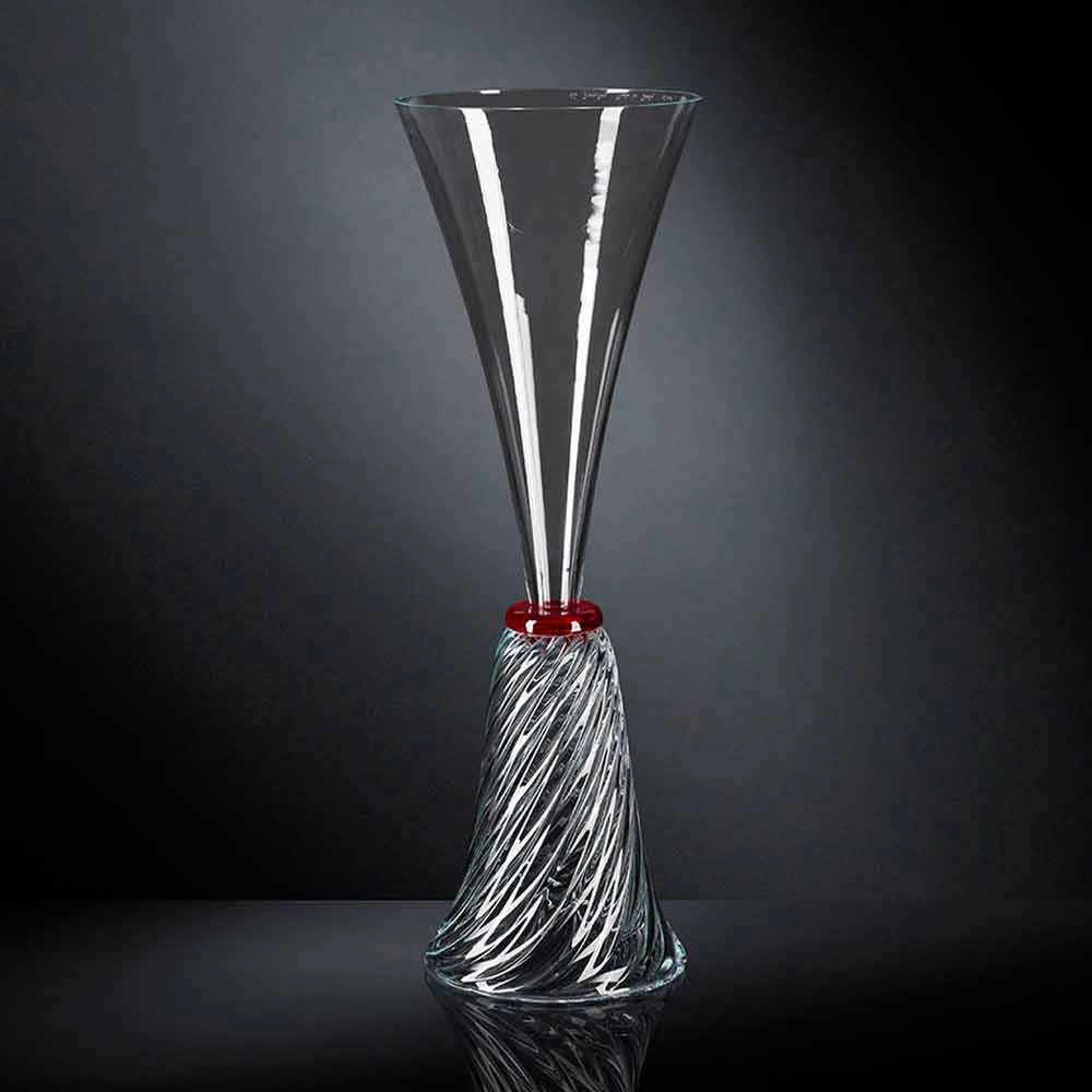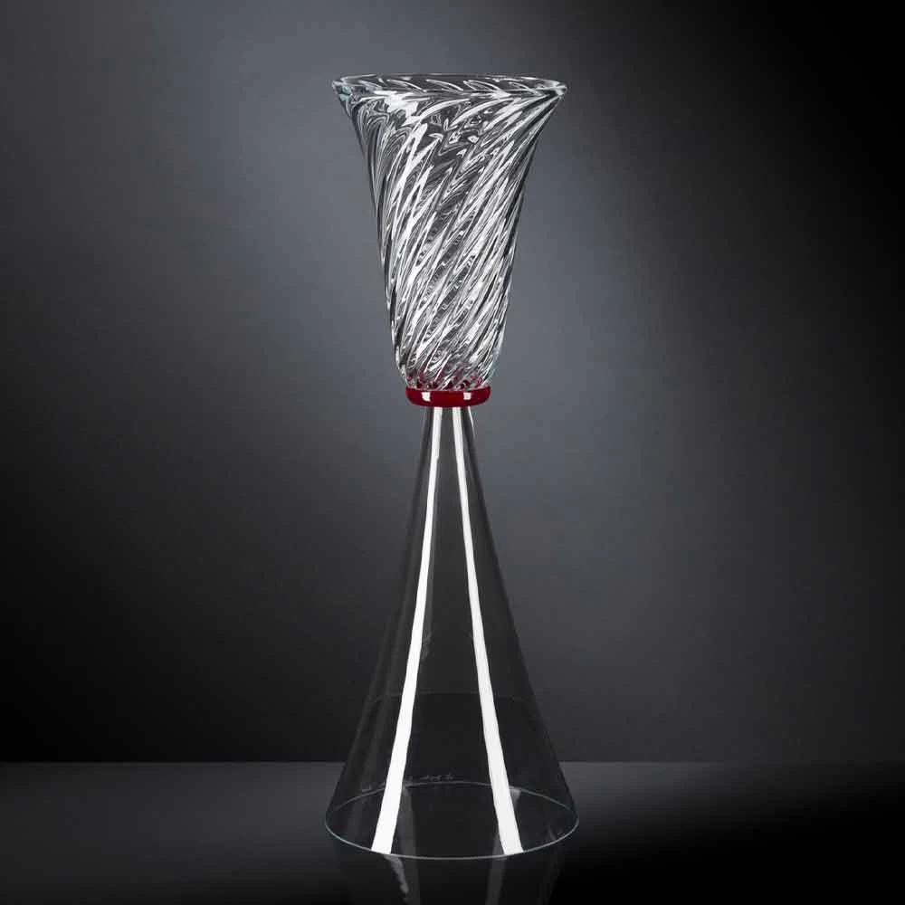 Vase d’intérieur élégant en verre soufflé de Murano transparent avec détail rouge grâce à un processus entièrement Made in Italy . Un design unique et raffiné qui rappelle les formes d’un sablier revisitées dans une touche contemporaine pour donner vie à une idée de mobilier exclusif et avant-gardiste. Son esthétique s’avère particulièrement polyvalente grâce aux finitions neutres utilisées qui soulignent à la fois sa valeur et sa haute qualité ainsi que la magnifique finition qui caractérise la partie supérieure du vase. Un style idéal pour les environnements les plus variés, de l’ameublement à celui des hôtels, restaurants, zones contract, spas mais aussi comme cadre pour des événements et des mariages.