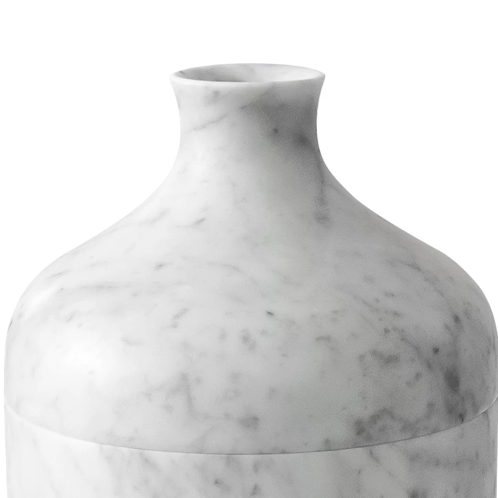 Ce vase décoratif présente un design artisanal et luxueux divisé en 3 parties, entièrement réalisé en marbre blanc satiné de Carrare.