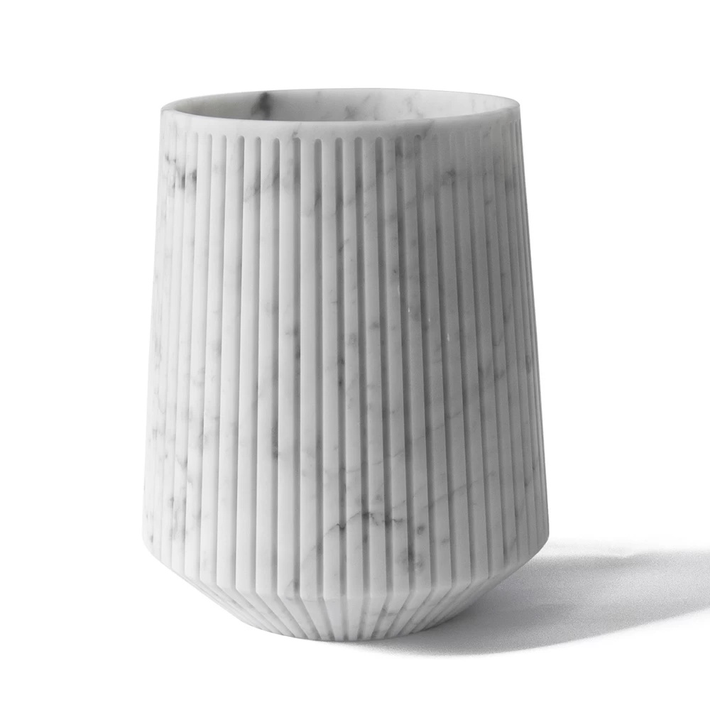 Ce vase décoratif de grande forme est un objet d’usage quotidien en marbre de Carrare finement travaillé capable de donner de la singularité à l’espace à travers le design et les éléments décoratifs forts.